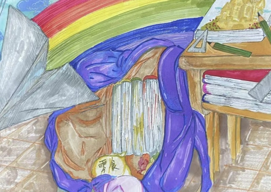 名称:《书包里的童年幻想》 这幅画以紫色书包为核心,展现满溢童趣的校园日常。书包中,课本整齐排列, "零食" 标签彰显孩子的小秘密,搭配花朵点缀。旁边课桌上,书本、文具随意摆放,桌上还有城堡图案,似藏着奇妙想象。背景里,彩虹横跨天际,纸飞机欲乘风而起,将校园生活的纯真、对世界的幻想融合,每一抹色彩都晕染出童年特有的烂漫与对未知的憧憬 。