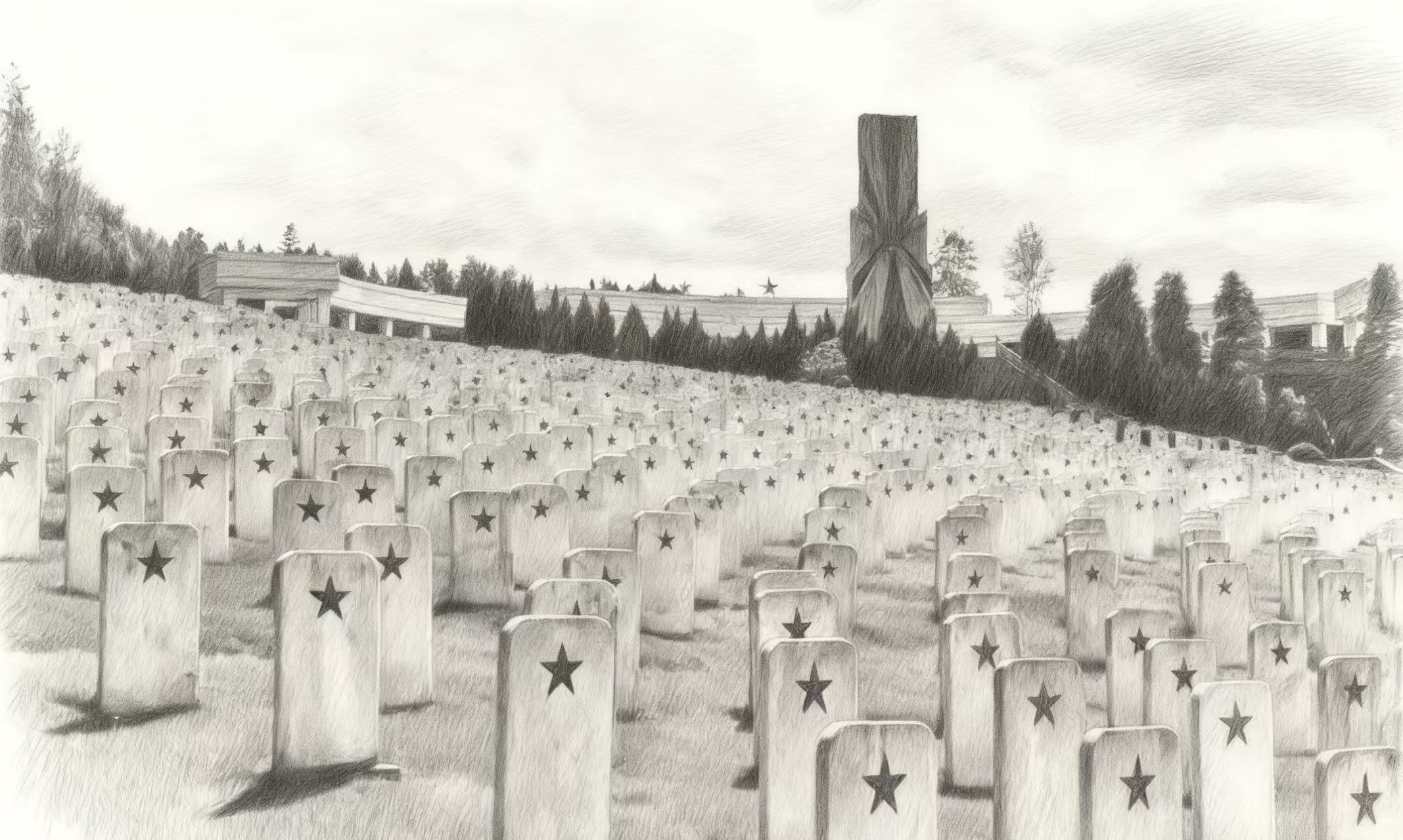 画这张的时候,我刻意用了最淡的铅灰铺背景——天不该太亮,像这些沉默的碑石一样,该带点沉在岁月里的温重。 一笔笔描那些整齐的星芒时,总想起"名字会被风磨平,但光不会"。碑是冷的,可成排的星聚在一起,倒像把无数个没说出口的故事,轻轻按在了这片土地里。 远处的碑塔没画得太锐,它该是个"影子"——替那些没站在这里的人,守着这满坡的星。 铅痕没擦太干净,留了点毛糙的质感:就像纪念从不是光滑的仪式,是带着温度的、轻轻落在心上的分量。