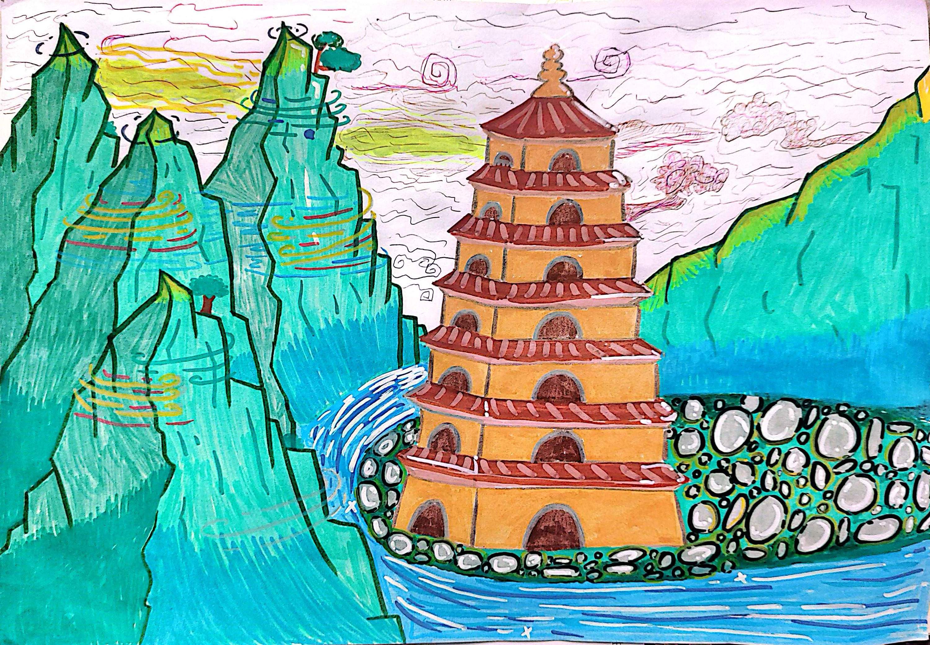 名称 《翠岳琼楼》 简介 这幅画以山水与古建为主题,青绿山峦层叠,灵动线条似云雾缠绕,添神秘氛围。橙黄古楼飞檐翘角,红瓦点缀,沉稳古朴。流水环绕、石滩点缀,将自然山水与人文建筑融合,展现出独特的东方意境,仿佛带领观者踏入一处宁静悠远的世外天地,感受传统美学的韵味 。
