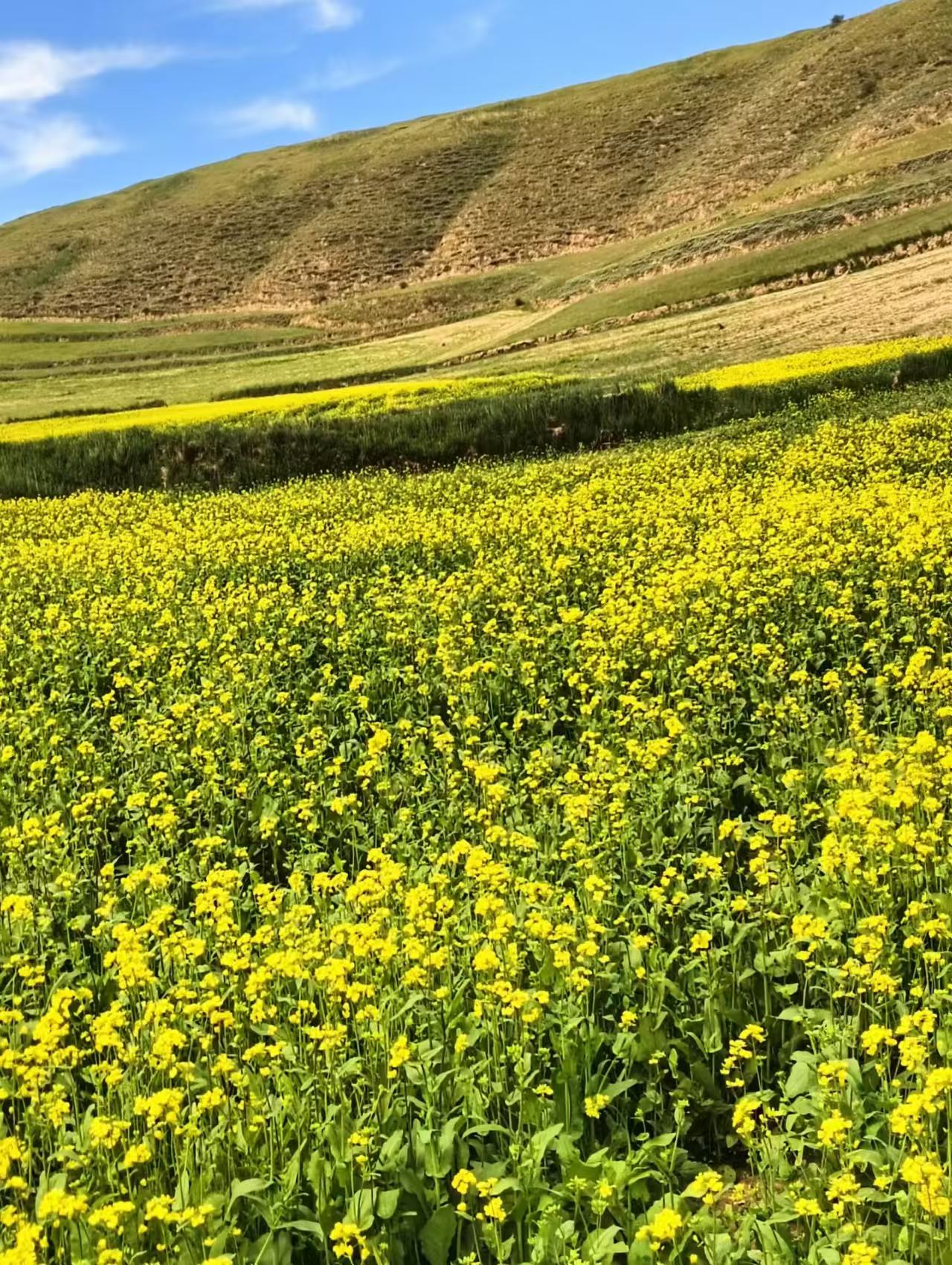 家乡油菜花那是非常有名的,每年夏天满山田地的油菜花开了,一片黄灿灿的,这可不是上帝打翻了黄色的颜料盒,漫山遍野的油菜花在大地母亲的招呼下"唰"地一下全醒过来了!大的小的,高的矮的,胖的廋的一下子来了精神争先恐后的迎风起舞。 走在田埂上,远远望去,那一片金黄连着一片片,像给大山盖了块软软的黄绒毯,花丛中的杂色小花像撒了满地的小星星,亮堂堂的晃人眼。风一吹,油菜花们就挤挤挨挨地晃脑袋,伴着小蜜蜂们嗡嗡的飞舞声载歌载舞,还送来甜甜的香味,吸一口,连鼻子尖都变香了。 来吧朋友欢迎你来我的家乡看看我们家乡的油菜花海,品尝油菜籽油做的香香甜甜的油饼子卷糕。