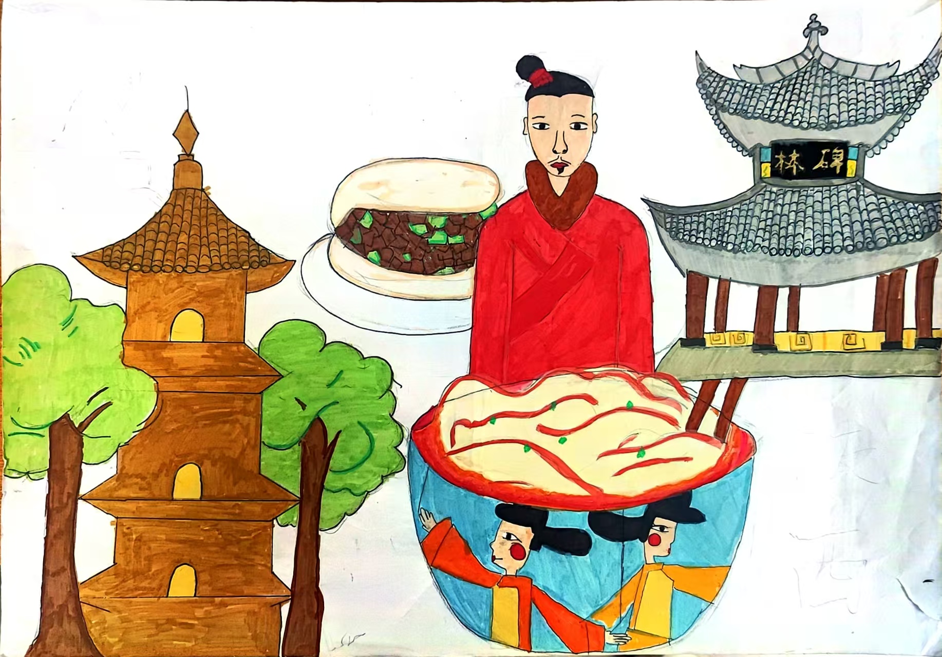 这是我为家乡陕西画的旅游宣传画——画面里的亭台楼阁,兵马俑是咱这儿的老牌景点,青瓦翘檐的模样藏着好多老故事,逛累了可以尝尝我家乡的美食肉夹馍和扯面,我们陕西省当真是"走一步见古建、尝一口是烟火"的宝藏旅游地。 要不要我帮你写几句家乡旅游小标语,让宣传更有意思?