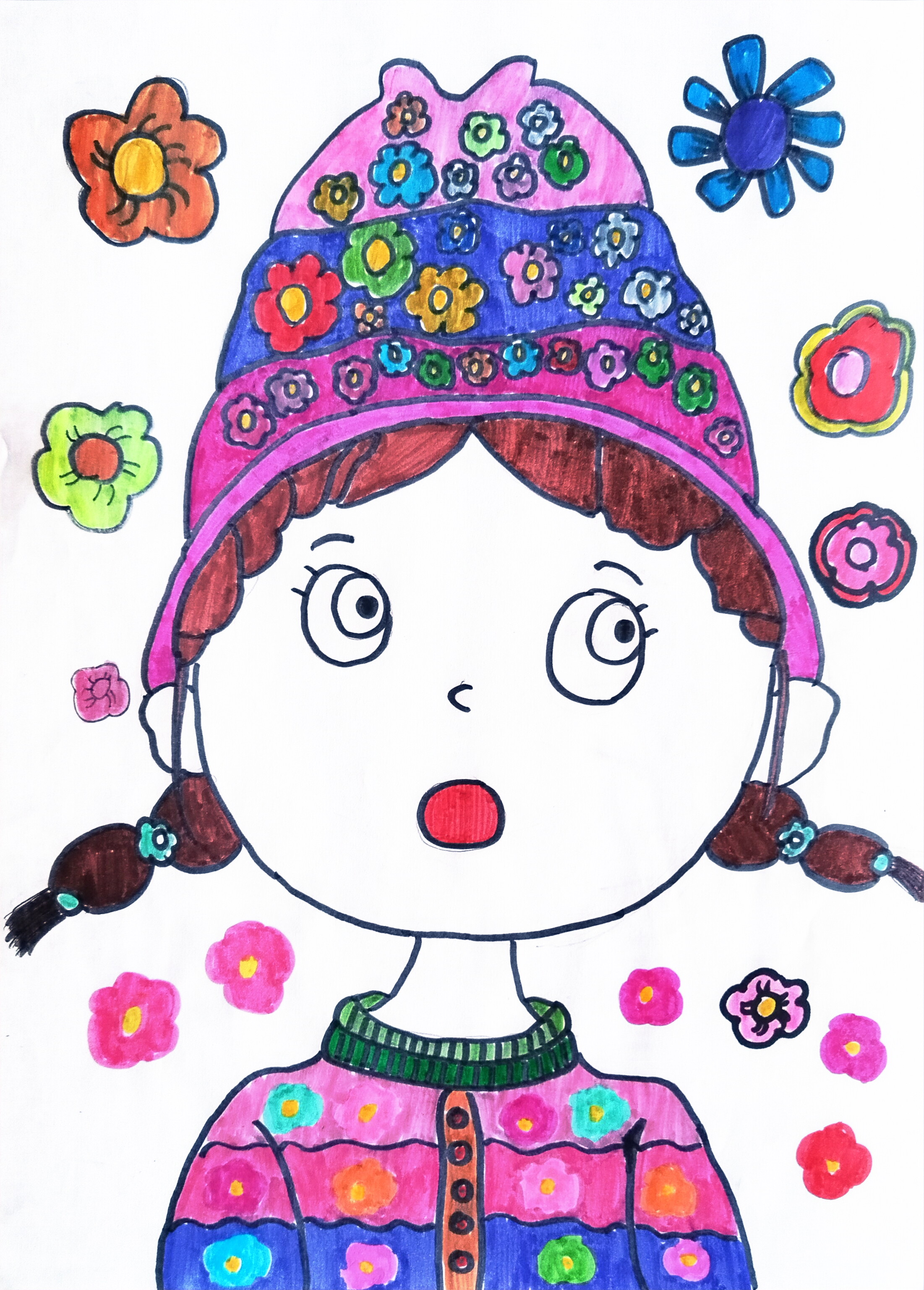 女孩裹在满是花饰的世界里:粉蓝拼色帽绣着彩花,棕辫缀着小饰,圆眼红唇透着灵动的惊讶感,花衣绿领衬得神态更鲜活。周围的彩花像把春日花簇全揉进背景,既用浓烈花饰衬出活泼氛围,又以孩童式的鲜亮笔触,把日常模样画成了藏在花团里的甜俏小精灵。