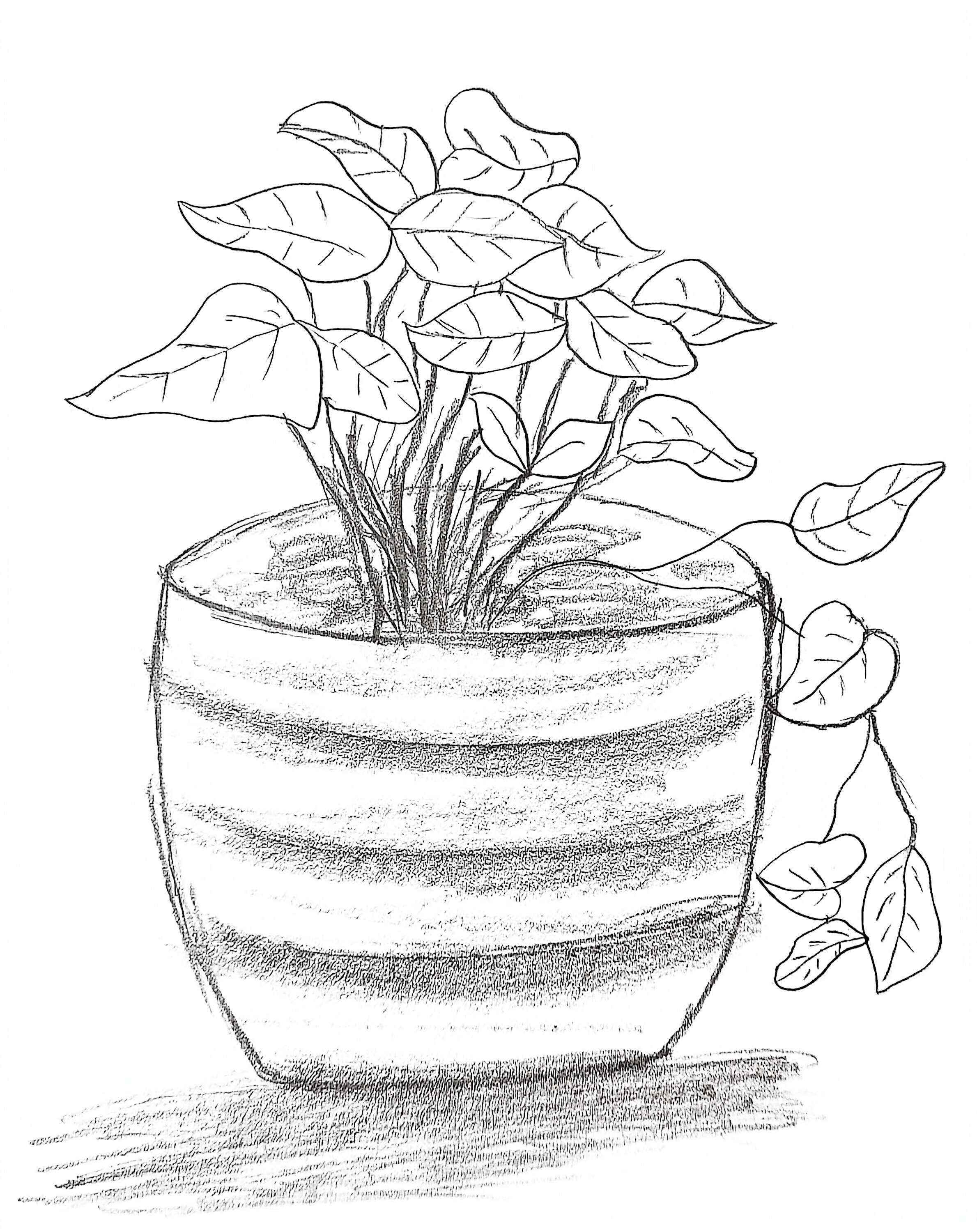 静室青蔓 这幅素描呈现一盆绿萝,线条勾勒出叶片的舒展与藤蔓的灵动,花盆纹理质朴。绿萝常伴案头,以常绿之姿,滤浊生清,在静谧空间里,似无声挚友,用柔蔓与青叶,晕染出悠然恬淡的生活气息,为室中添一抹自然生机 。