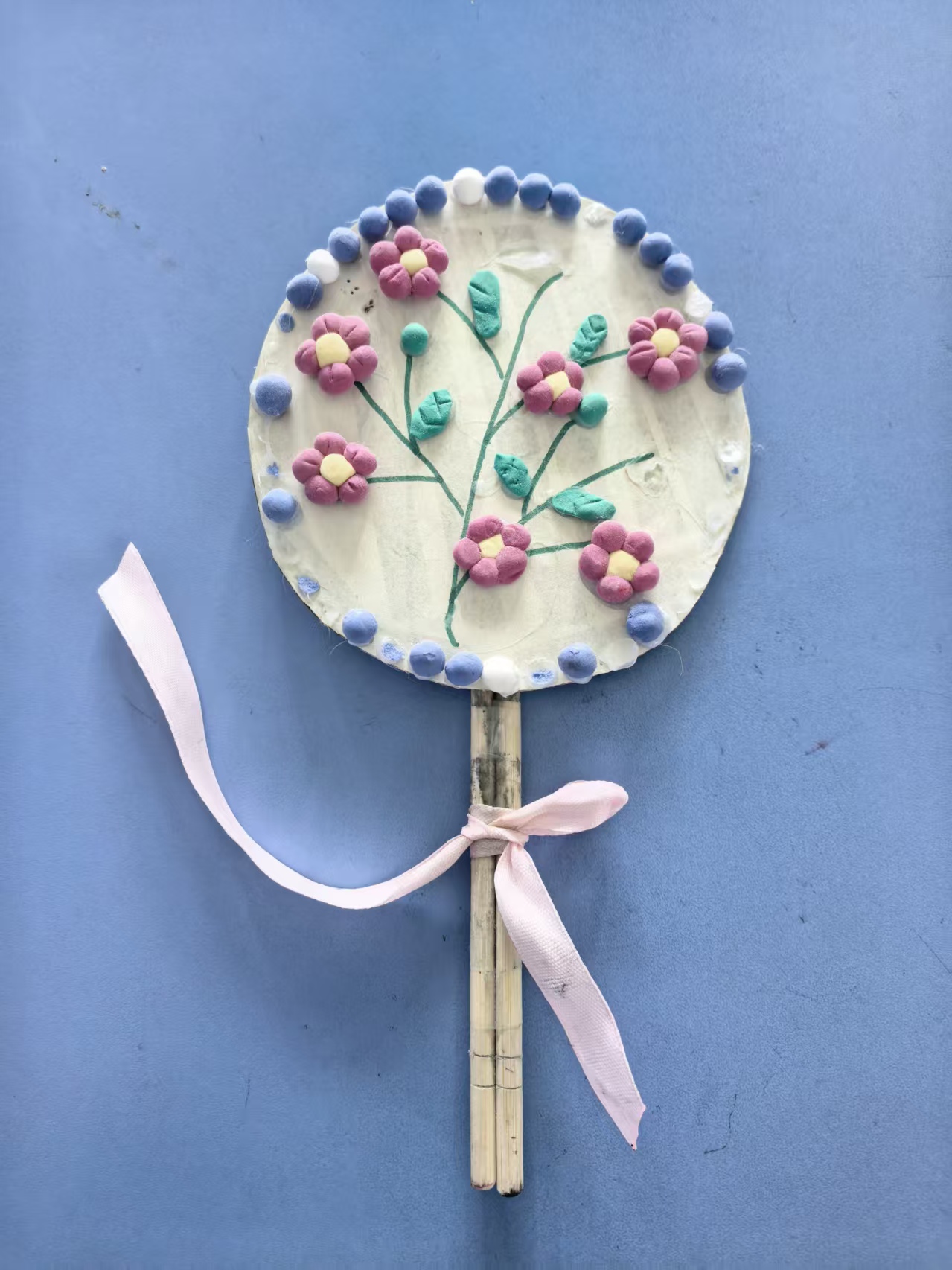 常常看妈妈绣团扇,妈妈还说:团扇象征家庭团聚,生活美满,寄托着美好的祝福。我就想自己做一把手工团扇。我先用纸板剪出扇子的形状,然后仿照妈妈绣的花用橡皮泥做出花朵,枝叶粘在扇面上,最后围着扇面一圈站上各色的橡皮泥珠子。一把扇子就做好了。我要把它送给老师,祝她生活幸福美满。