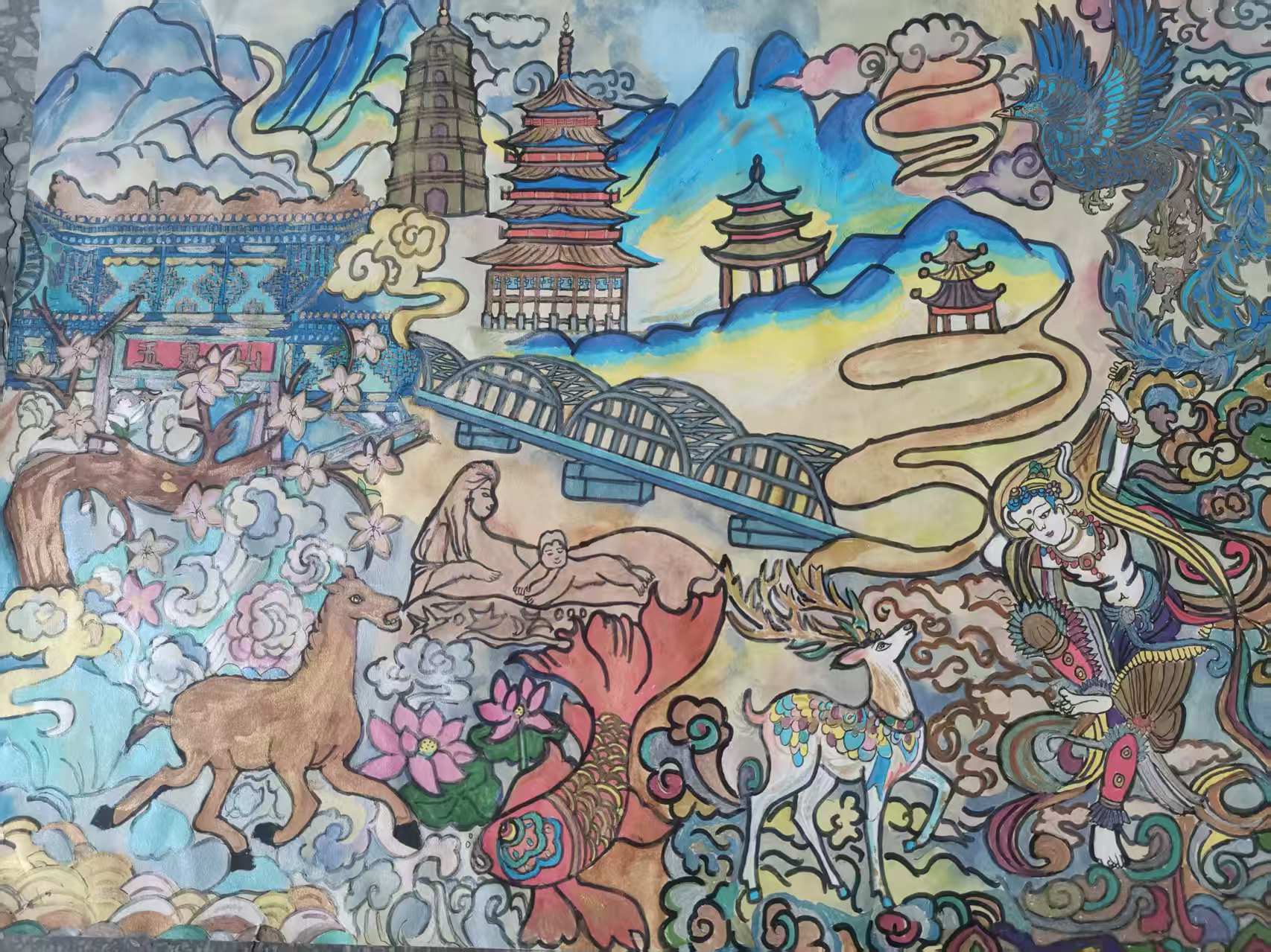 这幅画如同一扇通往甘肃的奇幻窗口.画中,敦煌飞天衣带飘飘,似正从莫高窟的壁血中轻盈跃出,承载着千年的艺术神韵与宗教传奇.奔腾的骏马,是河西走廊上自由的风,呼应着古代丝路商队的驼铃.见证着东西方文明的交融 兰州中山桥横跨画面,钢铁的骨架诉说着城市的近代变迁,它是黄河之上的不朽丰.碑,周边的古建筑,飞檐斗拱,在云蒸霞蔚间,宛如历史的守望者,铭记着岁月的沧海桑田.五彩的风凰与灵动的瑞兽,穿梭于繁花祥云间,既带着远古图腾的神秘,又彰显着这土地的生机,从敦煌的佛国圣境,到兰州的市井烟火,每一处元素都在诉说甘肃的故事它是历史的沉淀,是文化的厚积,是自然与人文交织的梦幻诗篇