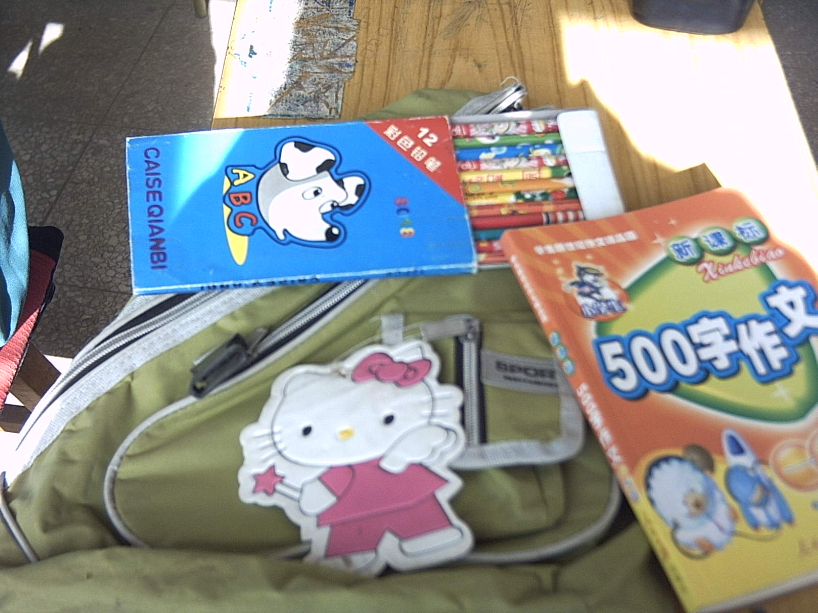 先来看看我的大 "百宝包"吧!它是绿色的,穿着时尚的衣服,身上有好几道口子,都上了拉链,里面装的都是"宝贝",下面还挂着个小花猫,非常可爱。
