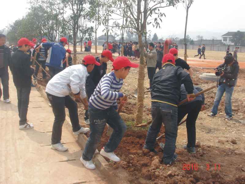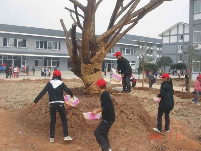 看,在阳光下,一个个身手矫健的青少年,忙碌的奔波于整个活动现场。这边的同学们合力挖了一个大坑,然后再小心翼翼地将树苗抬进坑里,栽种起来,接着开始铲土,一铲一铲,一铲又一铲,同学们铲的不仅仅是一把普普通通的土,他们铲的是一个个的希望啊!播种一棵树,不仅种下了树苗,还种下了希望。看他们一个个干得不亦乐乎。土培好后,同学们又拿着水桶盛了水,细心地浇灌下去,仿佛是母亲对小婴儿细腻的呵护一样。在一片紧张的忙碌之后,树种好了,同学们的脸上的疲惫也被欣慰的笑容驱散了。