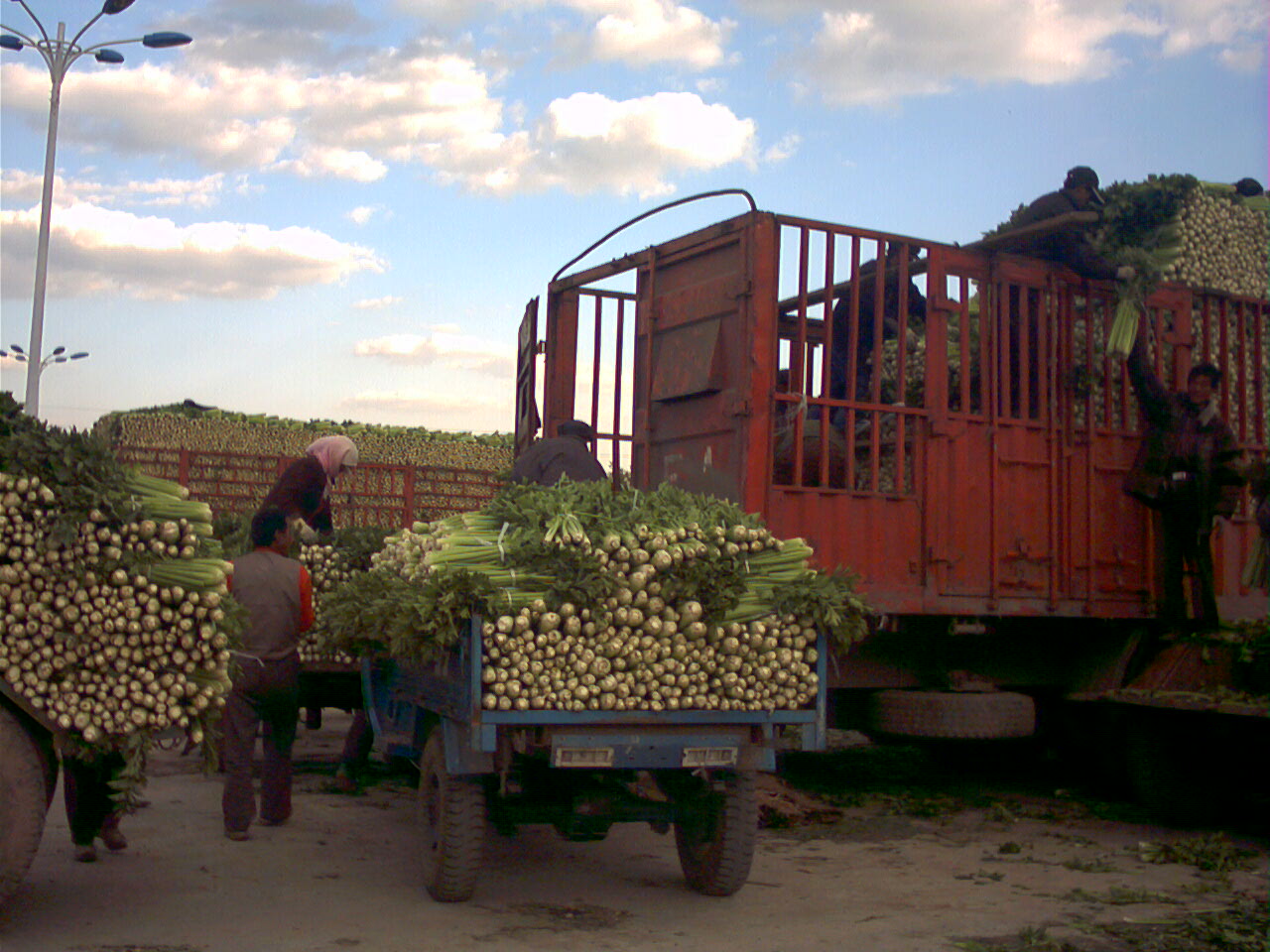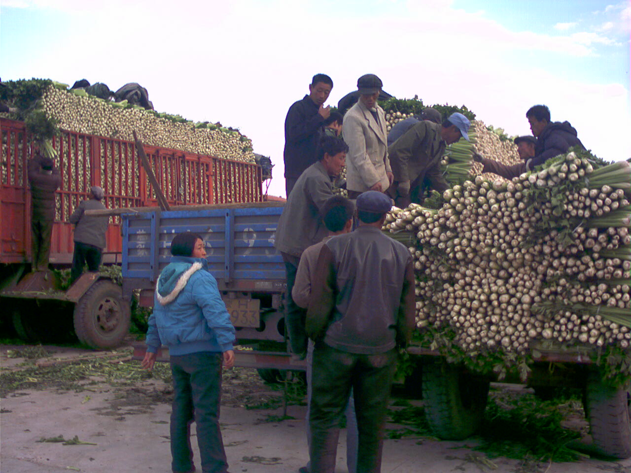 要进行蔬菜交易可不能少了工人,看,他们多勤劳,汗水出透了衣服也不知休息,还在不停地工作。
