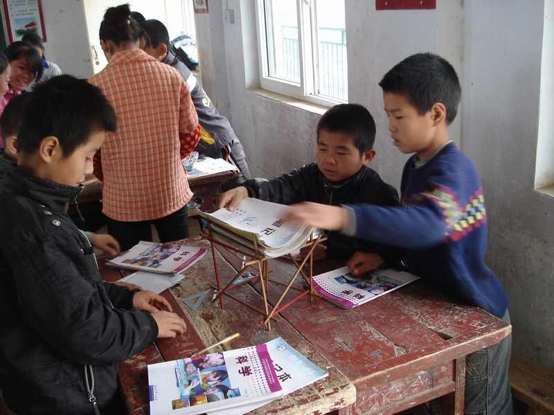 首先用筷子和皮筋做一个三角形和一个四边形,我们组由张毅和毛娇艳做三角形,我和李琳做四边形,老师要求我们在2分钟的时间内完成。时间到了,老师问我们发现了什么?大家纷纷举起手。回答的机会让第五组的同学抢去了!他们用演示回答:三角形具有稳定性,四边形具有易变性。新的问题出现了:怎样能够让四边形也比较稳定呢?于是开始我们的第二个实验。