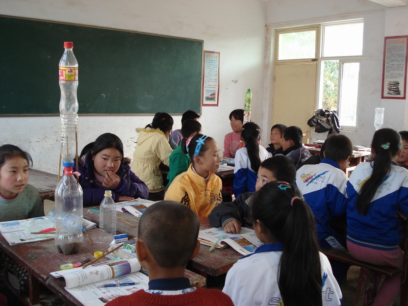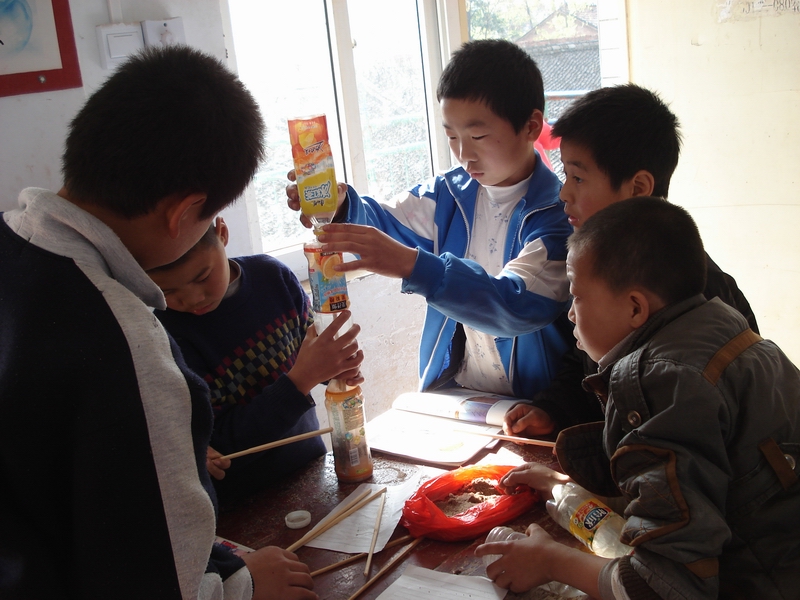 早上,同学们到校时就以小组为单位带来了瓶子、筷子、胶带等实验材料。第一节、第二节,时间才慢吞吞地来到了科学课堂,每一组同学的课桌上都摆放着塑料瓶、沙子、筷子……