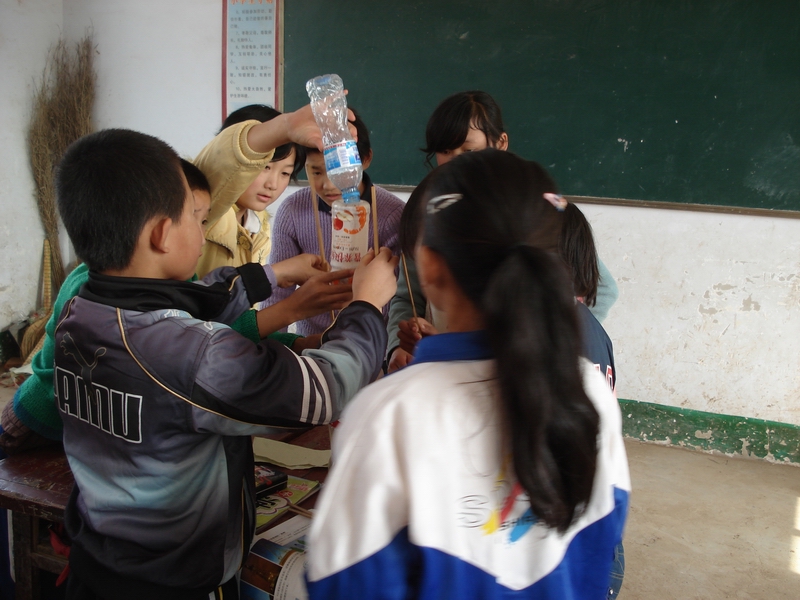 我们组的几个人先拿出最大的塑料瓶,往里边倒入沙子,用小刀把瓶盖挖了一个小洞,插入筷子,然后又拿了一个小一点的塑料瓶,照样在瓶盖上挖了洞,倒立着用筷子串起来,这样,两个一大一小的塑料瓶就被我们连在了一起。到了第3个瓶子时,由于瓶盖太厚,我们只好改变了方法:把两根筷子分别放在瓶子的外部,用胶带缠住瓶子和筷子。就在我们要连接第四个瓶子的时候,老师规定的时间到了,我们不能再继续加高“塔”,大家都有几分失望。本来,我们的高塔还可以继续更高的。