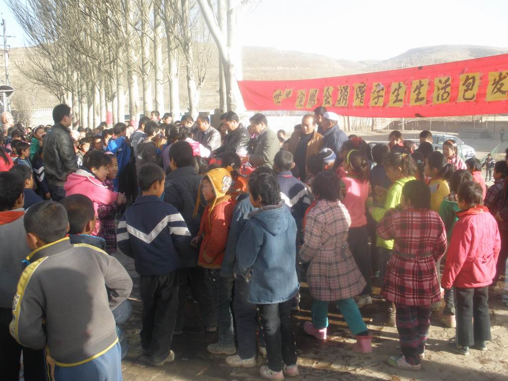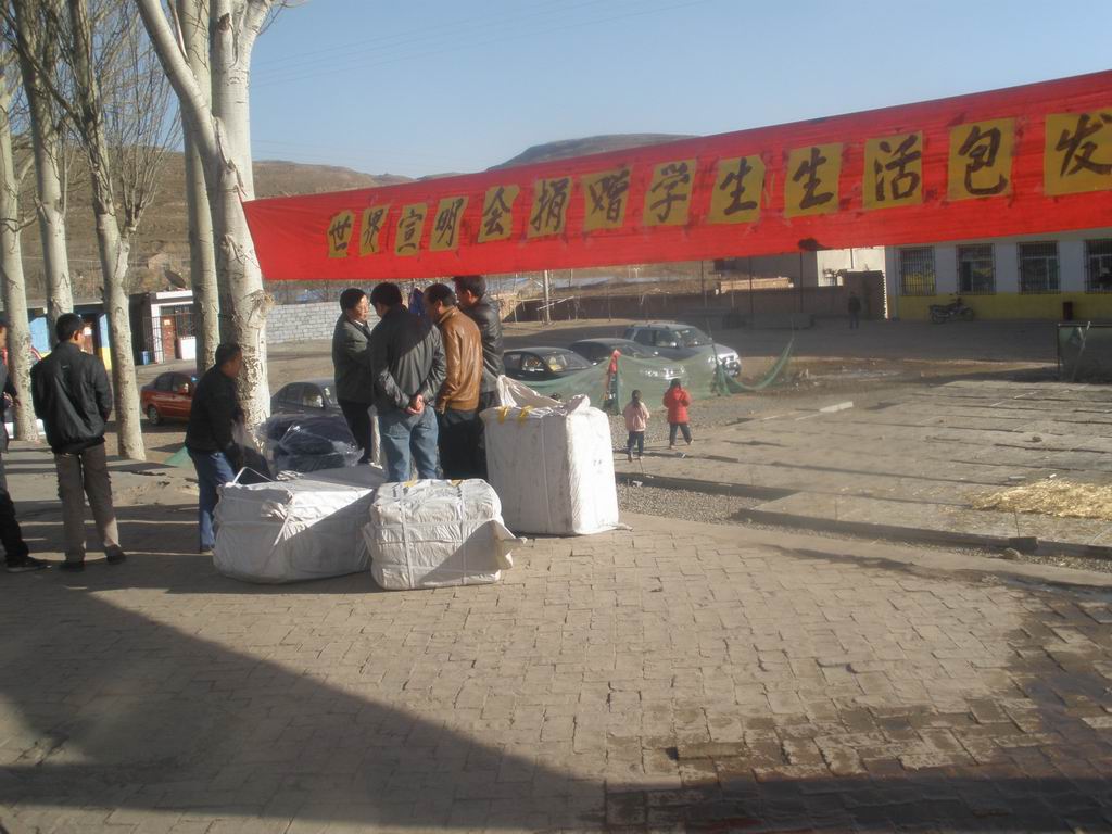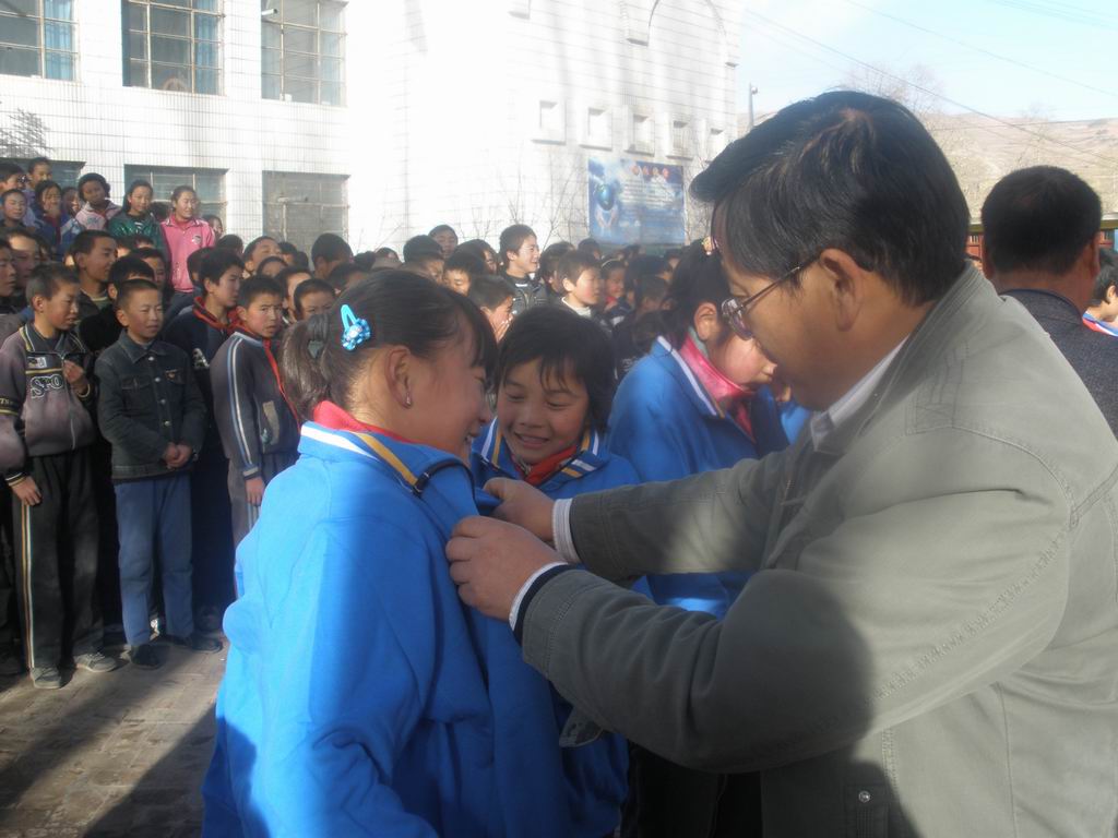 等发完了这些包,校领导开始讲话了,同学们都很激动,接下来受捐赠的同学们站在一排,校领导亲自拿出一件件衣服,发到同学们的手里,每个受资助的同学都兴奋地在身上比来比去,张校长还亲自帮一位同学穿上那件蓝色的运动服,那场面真是激动人心。我看出同学们都很兴奋,因为他们的脸上都是无法掩饰的快乐。穿上衣服后,同学们笑容满面地站成一排,把包抱在胸前,老师为他们合影。