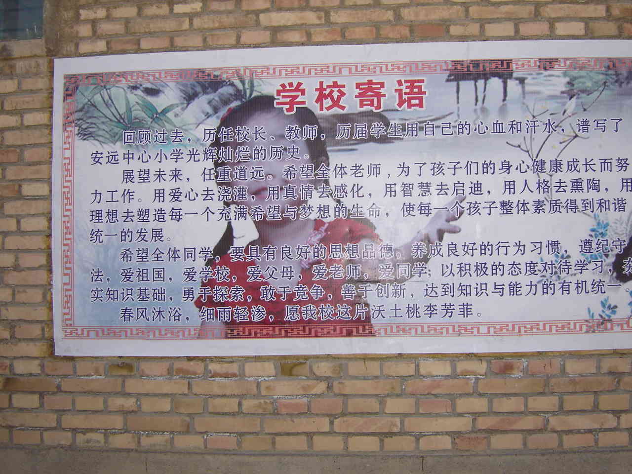 教室北边是小学生的行为规范语。它是我们每天做人做事的样板:上课不专心听讲了,老师提醒我们下课去看看;语言粗鲁了,想起来也很自责.....校园里的画,与其说是装饰校园,不如说是老师们语重心长的教导。谢谢老师了,他们真是用心良苦。