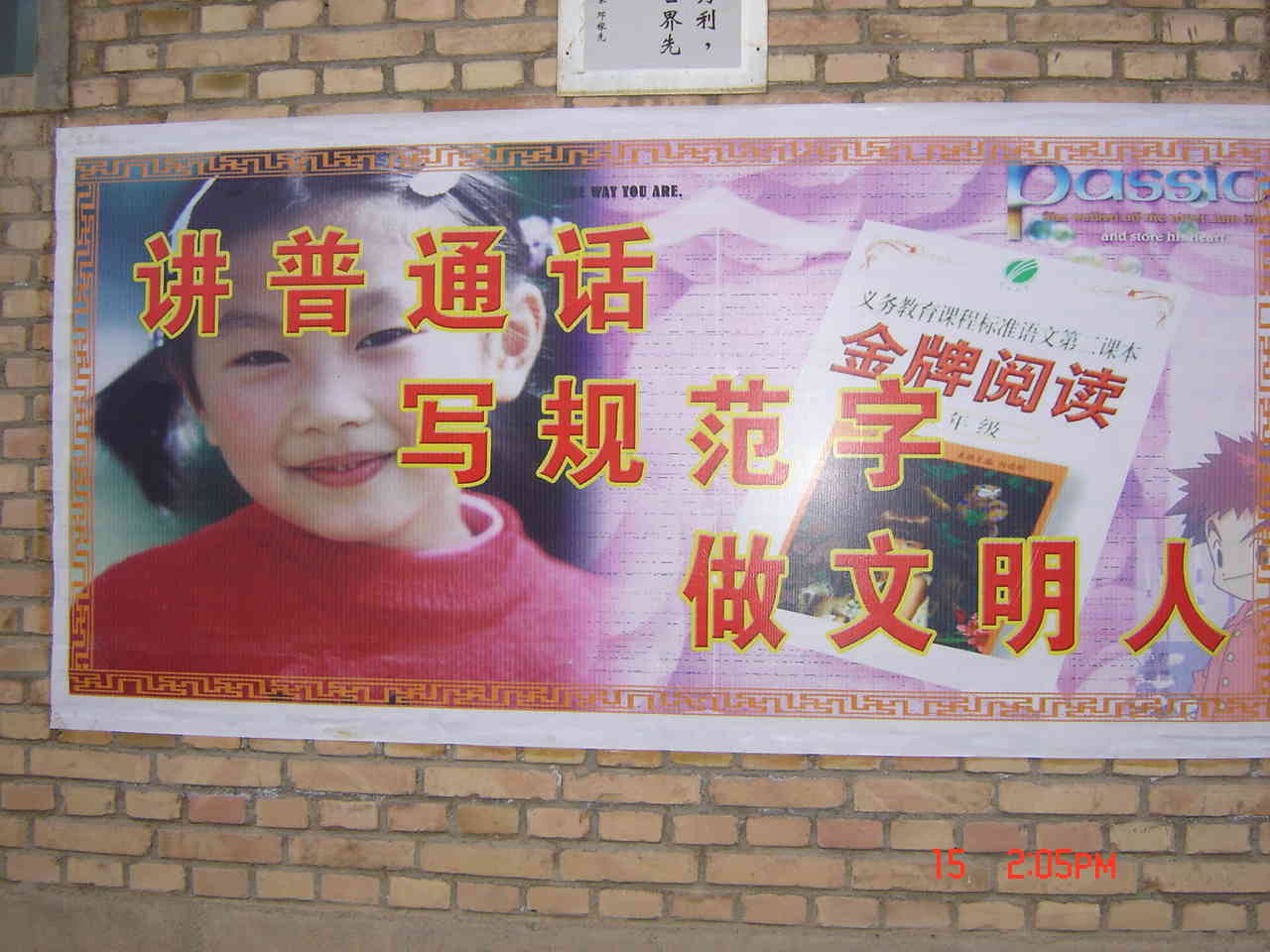 首先说说办公室门前,我们教室后墙上的画吧。最醒目的就是请写规范字,请讲普通话了。每当拿着本子去办公室改错时,我就有点惭愧,画中的小女孩好像在笑我:好粗心呀!看着自己歪歪斜斜的字,我的脸不由得红了。