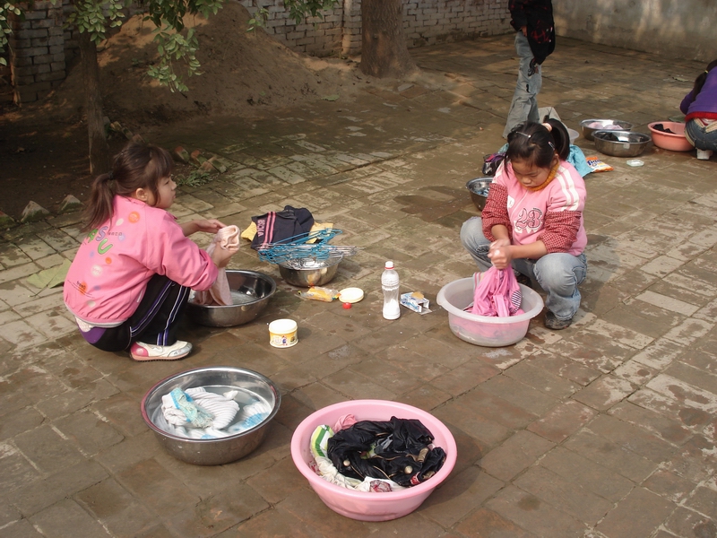 洗完衣服后,大同学便去厨房帮忙蒸馍,小同学便可以玩耍了。有些同学在看电视,和我们不同的是:他们的电视机没有一点声响!看到这一切,我感慨万千:虽然他们是聋哑生,但是他们经过自己的努力后,学会了许多,他们真的很优秀!他们也会玩跳方格、踢沙包等游戏呢!