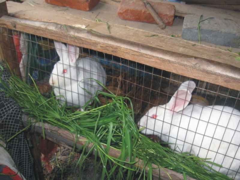 看到这两只可爱的小白兔了吗?它们正在津津有味地吃着早餐呢,它们像毛球似的身子一动不动,可嘴唇却上上下下嚼个不停,眼睛全神贯注地盯着一个方向,好像什么也不关注,只一心品尝着这美味早餐。我猜想此刻它们心里一定在想"嗯嗯,真好吃,真好吃"。