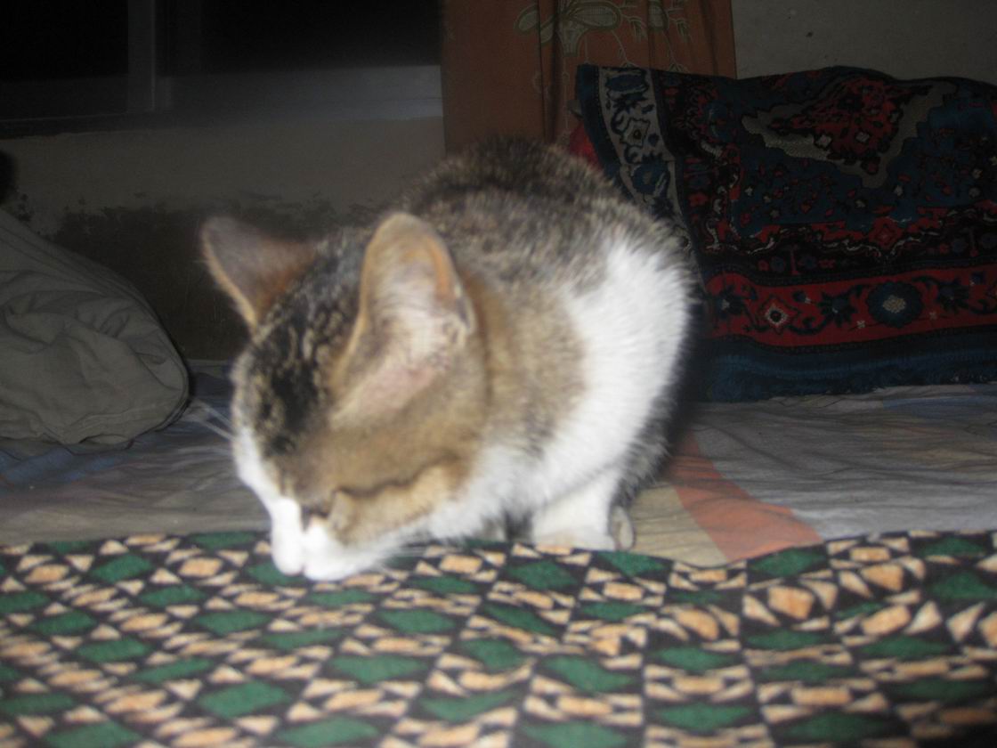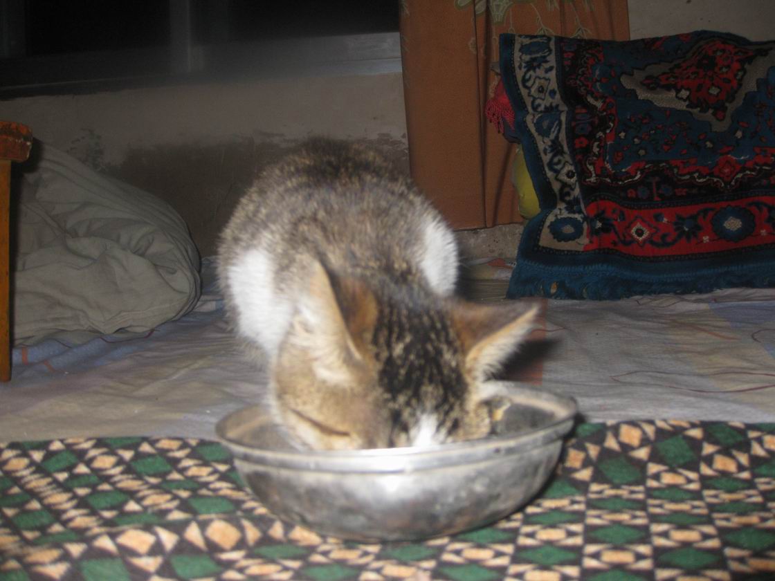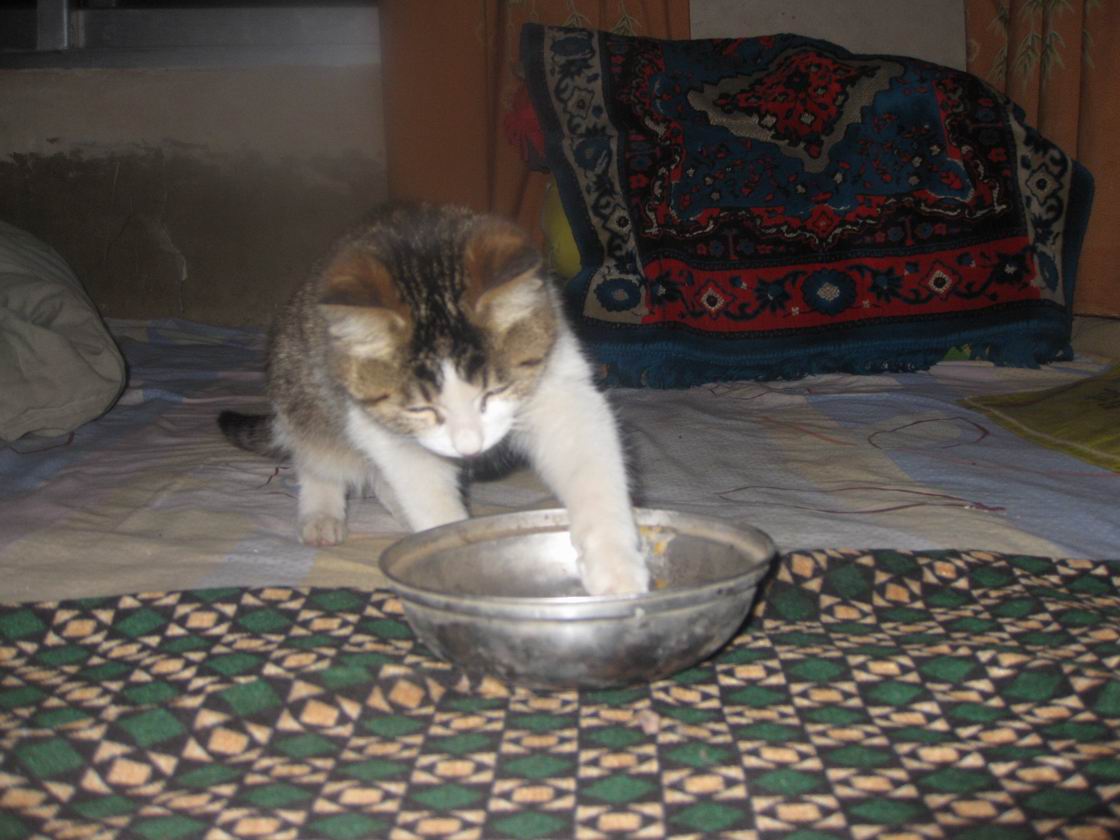 每次它饿的时候,都把尾巴翘起来,喵喵的叫个不停,好像在恳求我拿东西给它吃。我拿了个小碗,把牛奶倒在碗里,再放一些碎馍馍,小猫就用舌头舔起来,如果它吃饱了,你硬要它吃,它就会跑开。
