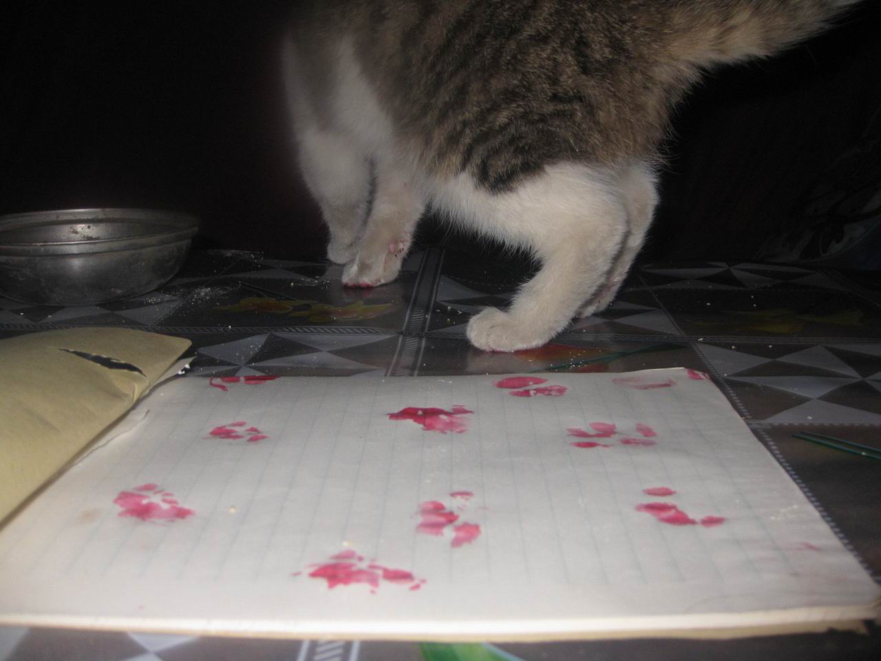 有一次我写作业的时候,它看见我的铅笔摇来摇去,就到我的本子上了,不知道它去了哪里,爪子上踩上了红色的印记,可能是妈妈做馍馍用剩下的红曲吧,结果印到了我的作业本上,很漂亮,像一朵朵的红色的梅花,好可爱的小猫啊!