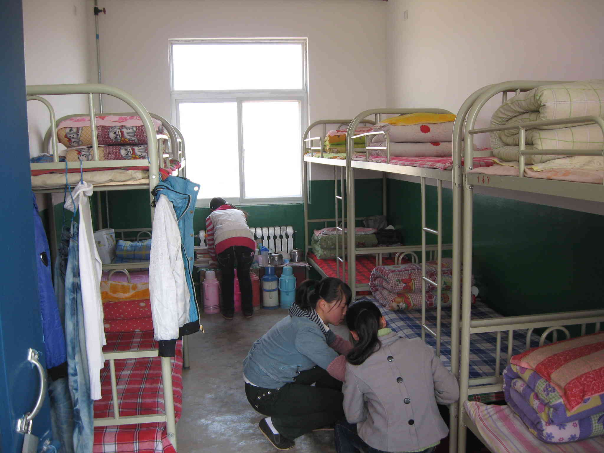 看!这就是我们学生原来所住的宿舍,它是一间破烂不堪的窑洞。听老师说,这是五六十年代所建成的,已有很长的历史了。这里的门窗是用木头做的,又小又旧,门只有一人高,个子稍高的人进来还要猫着腰,避免头碰到门框上,里面有一个用土和转头做成的大大的炕,这个炕上睡着大约十五个左右的学生。到了冬天,学生住在里面,特别的冷,没有炉子,没有电热毯,更别说暖气了,而且每人只能占一尺左右宽的地方睡觉,有时太冷了,两个人就合作起来睡在一个被窝,盖两个被子,但是还是冰冷冰冷的,大家就卷缩在里面慢慢的暖和。尤其是到了冬至,寒风凛冽,狂风咆哮,同学们都得端上大盆小盆急急忙忙去水灶灌热水,然后,把热水灌倒暖壶里来暖被窝。有时去晚了,热水就领完了,只能拿凉水洗脸刷牙,冻的同学们手红肿红肿的,有的裂开了口子,都流血流脓了,看着都害怕。好不容易送走了冬天,但讨厌的夏天很快来到了同学们身边。夏天虽没有冬天刺骨的寒风,但夏天有炎热的太阳。一个一间半大的窑洞得住上十几个学生,他们还要在这里面吃饭睡觉学习,宿舍后面又没有窗子,里面不通风,同学们又没时间收拾,弄得里面又闷又热,味道嗅薰薰的,但学生只能忍着,不管是夏天的炎热酷暑,还是冬天的寒风刺骨,我们这里一批一批的孩子就是这样度过了艰苦的初中生活。