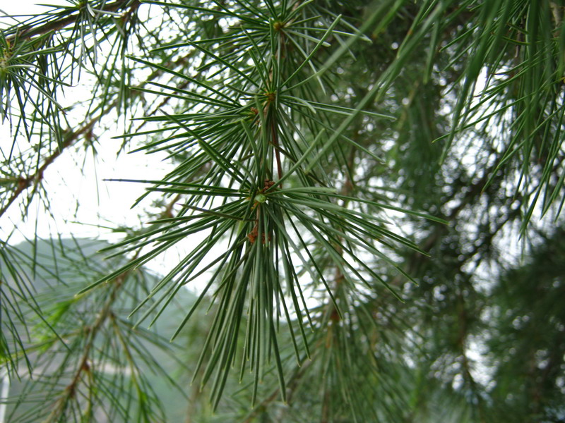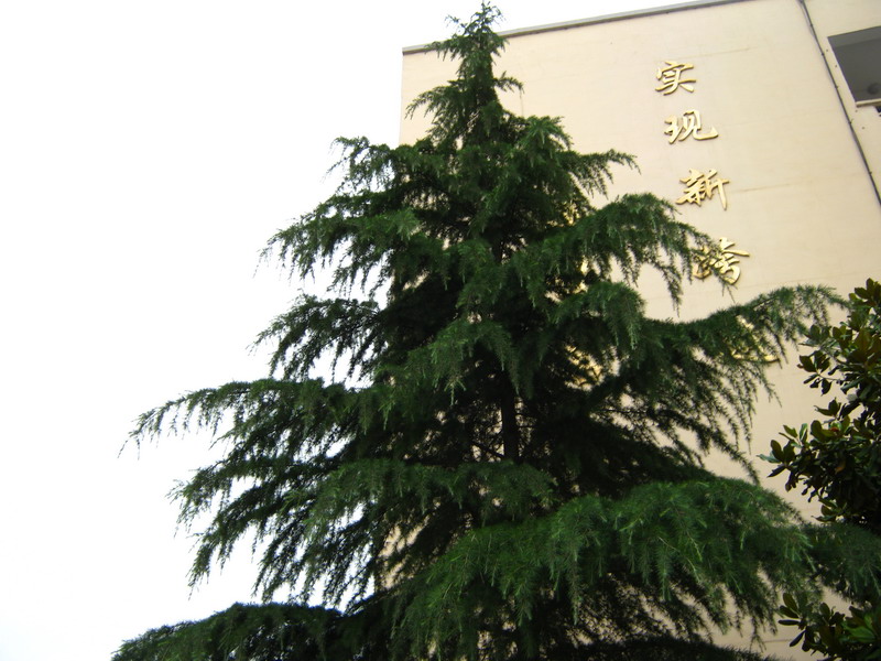 松柏的树干是紫褐色的,足有碗口那么粗,笔直笔直的,挺直着腰干,就像一个威武的哨兵,守护着校园,用手去摸一摸树干,非常粗糙,像一个老人的脸被刀割过一样,满脸皱纹。它的树枝斜着向上伸展,远看就像一座巨型宝塔。枝上插满了绿绿的、尖尖的、细细的、针形的叶子。要是你去碰一下松柏的叶子,你就会像雷电刺到一样的痛.