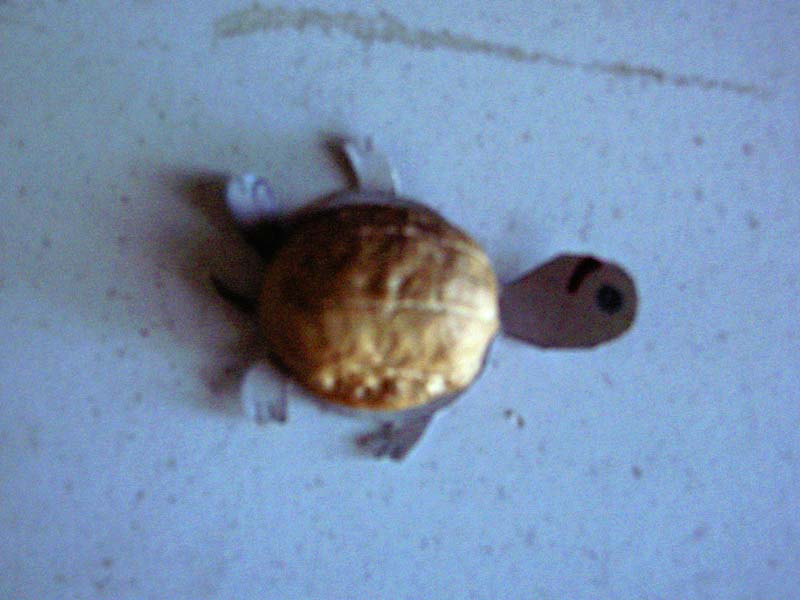 最后,要把剪好的,画好的纸与“龟壳”连在一起。方法是将“乌龟的头”对准核桃壳圆的一头,“龟尾”对准尖的一头,用透明胶带在前后脚之间将纸片,核桃壳固定在一起,这样,龟壳上就同时长出了头,脚,尾巴,一只活泼可爱,栩栩如生的小乌龟就神气地站在你面前了。你还可以在小乌龟的嘴巴上拴一根线,小乌龟就可以“奔跑”了。怎么样?聪明的你一定学会了吧!快快行动起来,多做几只漂亮的小乌龟,让我们的生活丰富多彩。