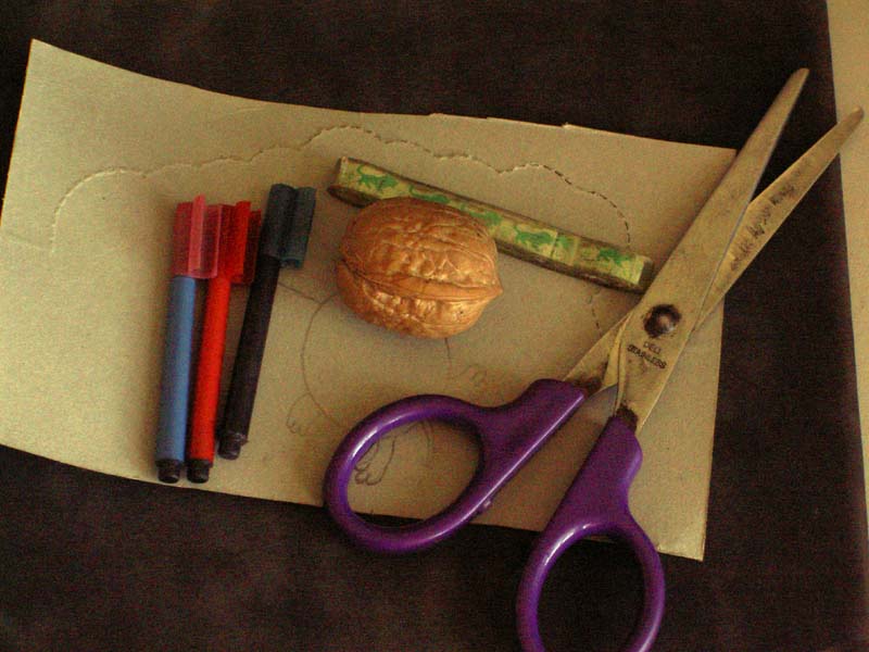 在制作以前,要准备好以下材料:一个核桃,一张硬纸板,透明胶带,还要备好剪刀和画笔。