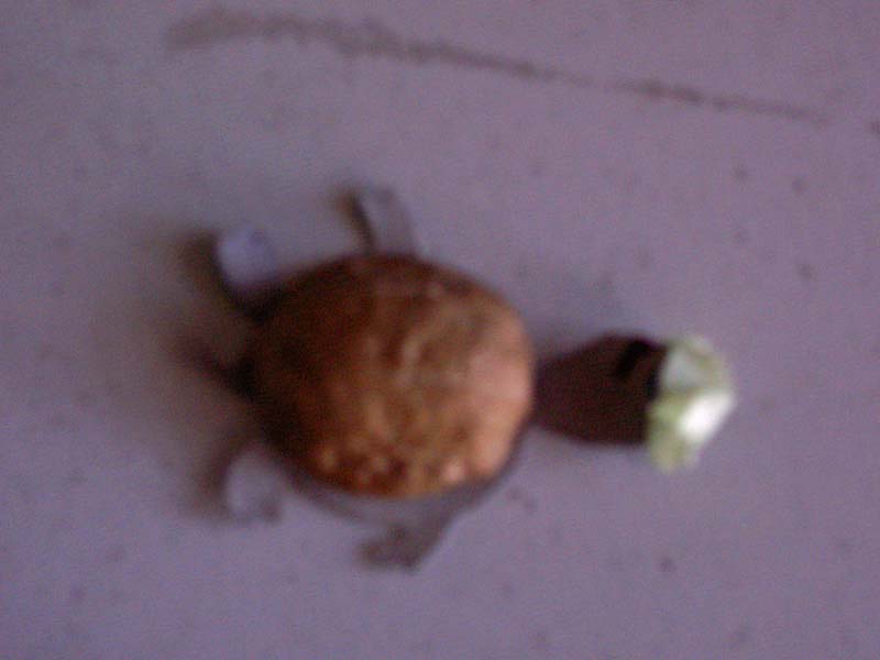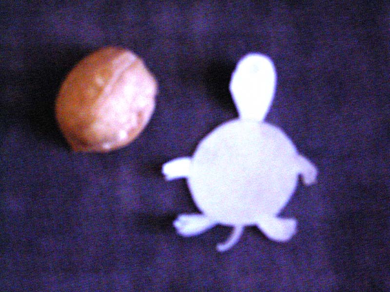 先要制作小乌龟的外壳。核桃的壳是对称长的,找准对称线后用锤轻轻的敲,让它裂成整齐的两瓣,取其中的一瓣,用圆圆的一头作前面,略尖的一头作后面,与小乌龟细小的尾巴相配。这样,做出来的小乌龟“体形”才会优美。