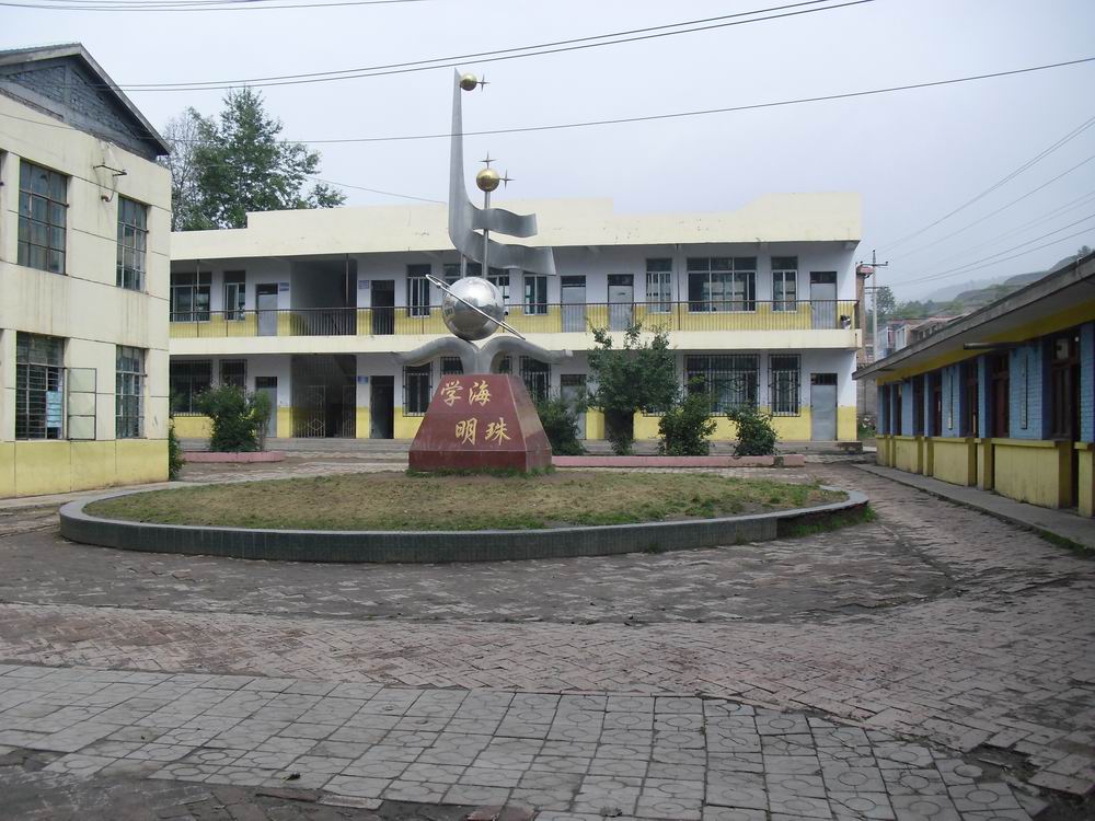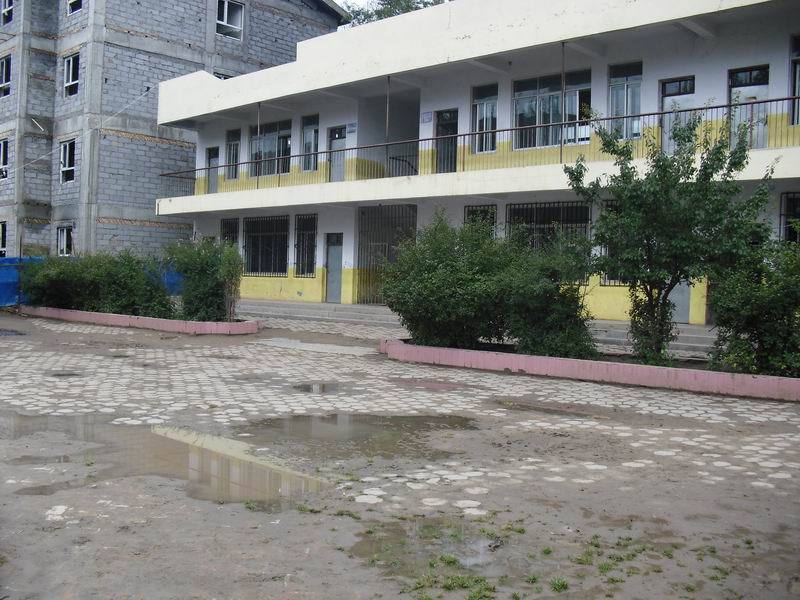 在教学楼前面是一个长方形的花园,里面有松树、杏树等。侧面是一个圆形的大花园,花园的中心是"学海明珠"。一阵阵秋风吹来,树上的黄叶随风飞舞,就像一只只的蝴蝶。从教学楼里不时传来一阵阵朗朗的读书声和悠扬的歌声,使人心情舒畅。