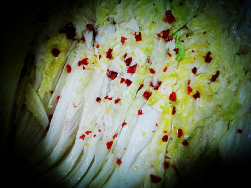 晚饭过后,妈妈又开始动工了,她把菜一朵一朵的切成两份或四份并撒上盐和辣椒粉,最后放进大缸中,而且还准备了五个大石头,又封住了缸口。看着妈妈完工了,我长叹了一口气"原来吃它还得费这么多功夫。"