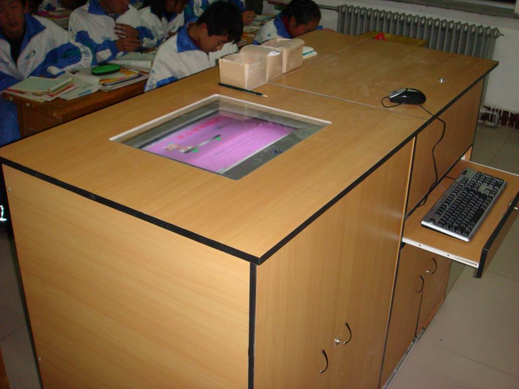 看看这张讲桌吧,多有气派,内部装备可先进了,不仅有高清的实物投影仪,而且还有性能卓越的联想电脑。看,现在放映的是物理老师制作的《笨小孩》课件(关于直线运动的),通过投影机投放出来后可以使教学过程清晰明了,简单易懂。