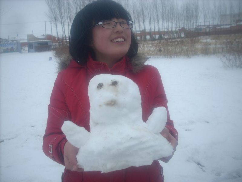 玩够了,不,是上课时间快到了,我们只好暂时休战,正要恋恋不舍返回教室,却发现了一个奇迹,顿时,我们都欢呼起来。原来在双方交战的激烈之时,竟然有一个“女战士”能忙里偷闲,完成一个雕塑。瞧,她抱着自己的“杰作”,笑得多甜。啊,入冬以来的第一场雪,感谢你,又让我们童心大发,痛痛快快疯了一把。