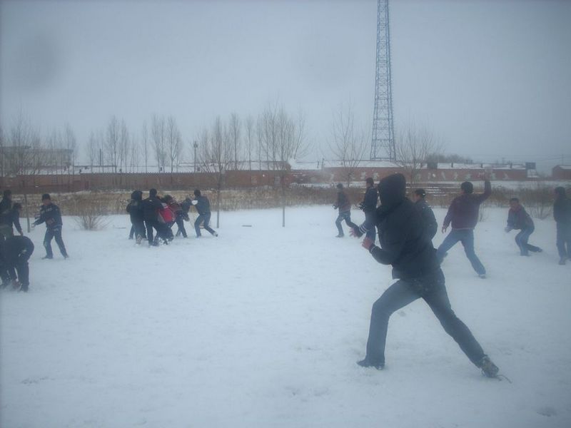 慢慢的,人越聚越多,也不知是谁点燃的导火索,一场雪战瞬间暴发。敌我双方不用谁来划分就自然分明,雪球就是子弹,脚下的积雪就是子弹的来源地。瞧吧,对垒的双方战得多么激烈,白色子弹不住地向对方发射。谁说雪制的子弹没有杀伤力,眼看的那一方只有招架之功,而没有还手之力。当然他们也不肯就此承认失败,正在伺机反击。