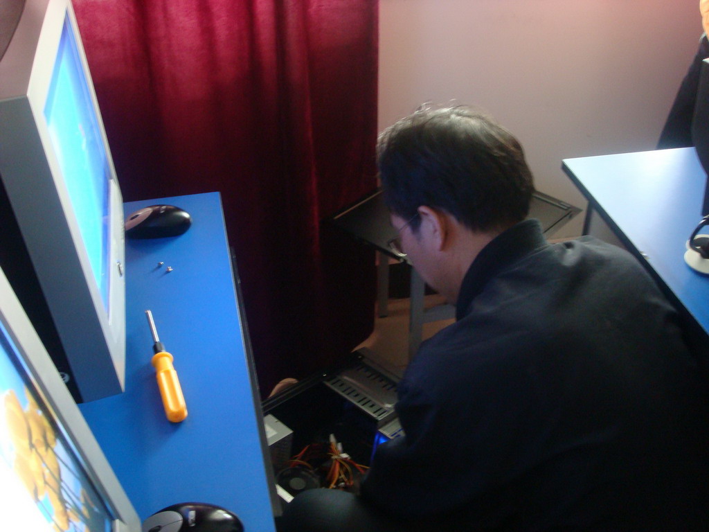 有的时候,一个小小的机箱内会出现很多问题,得需要结合多们老师的电脑知识才能把它医治好。你看,我们俩位信息技术老师在这边讨论边观察,问题很快就解决了。