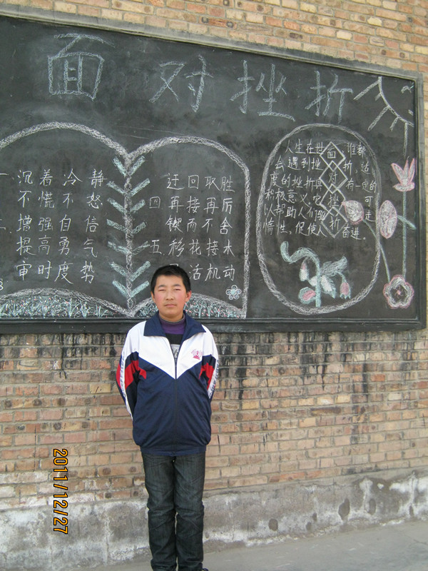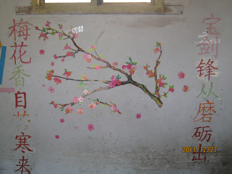 正门的对面墙上贴的是梅花,旁边还配上诗句:“梅花香自苦寒来,宝剑锋从磨砺出。”鼓励我们要像梅花一样不畏严寒,傲然开放,经得起挫折与困难。每当我们遇到困难时,看看梅花,就会有战胜困难的勇气和信心。