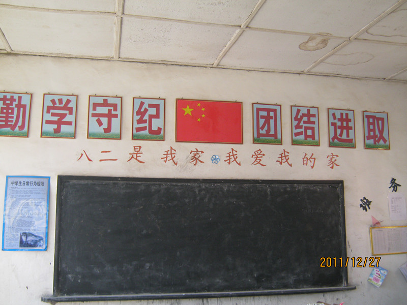 我们的教室外表看上去比较破旧。一进门就看见讲台,讲台前面是讲桌。讲台后面是一块大大的黑板,黑板上面是八个大字:“勤学守纪,团结进取”。八个大字中间是一面五星红旗,这说明我们生在新中国,长在红旗下,我们是社会主义的接班人。大字与黑板之间有一行小字:“八二是我家,我爱我的家。”这又让我们更加团结更加热爱我们的教室,我们的家。