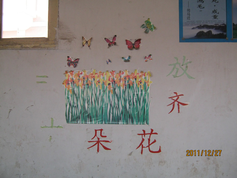 再往后面墙上还有一幅百花盛开图,蝴蝶停在上面,依然配上一句话:“三十朵花齐放。”我们是祖国的花朵,互相帮助,互相扶持,在改革开放的春风里尽情地绽放。