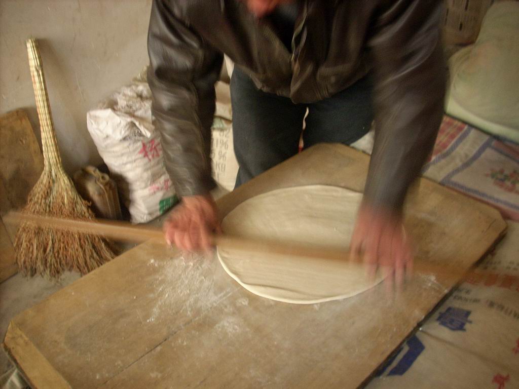 爸爸熟练的动作,先用力将面团作成圆形,然后将面用擀面杖均匀用力向各个方向伸展,最终一团面就变成又圆又薄的了。