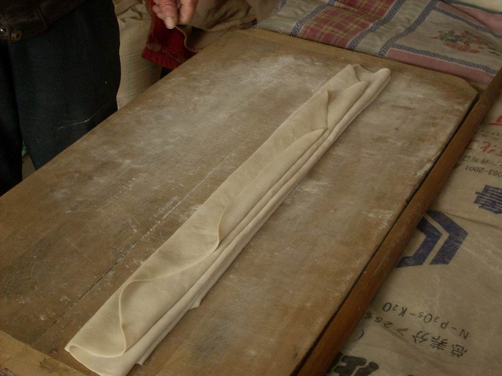 等到吃的时候,就将擀好的面卷在擀面杖上,一下一下叠整齐平放在案板上,就成图中的这样了。