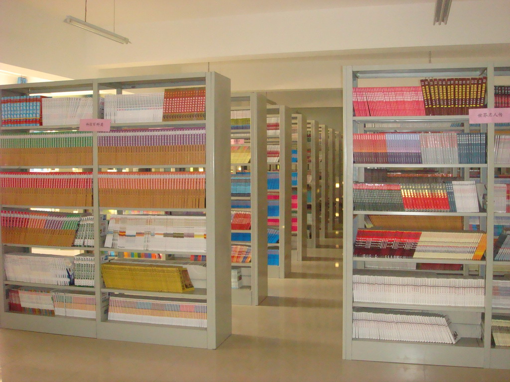 在这个长达几乎一百米、宽30米的图书室里,陈列着5排书架,每排都有10架,这里经过了合理的规划,各学科、各类别、各年级、各年龄的图书都摆放有序,整整齐齐!每天图书管理员都要仔细检查、认真打扫,保证图书室清爽、整洁。
