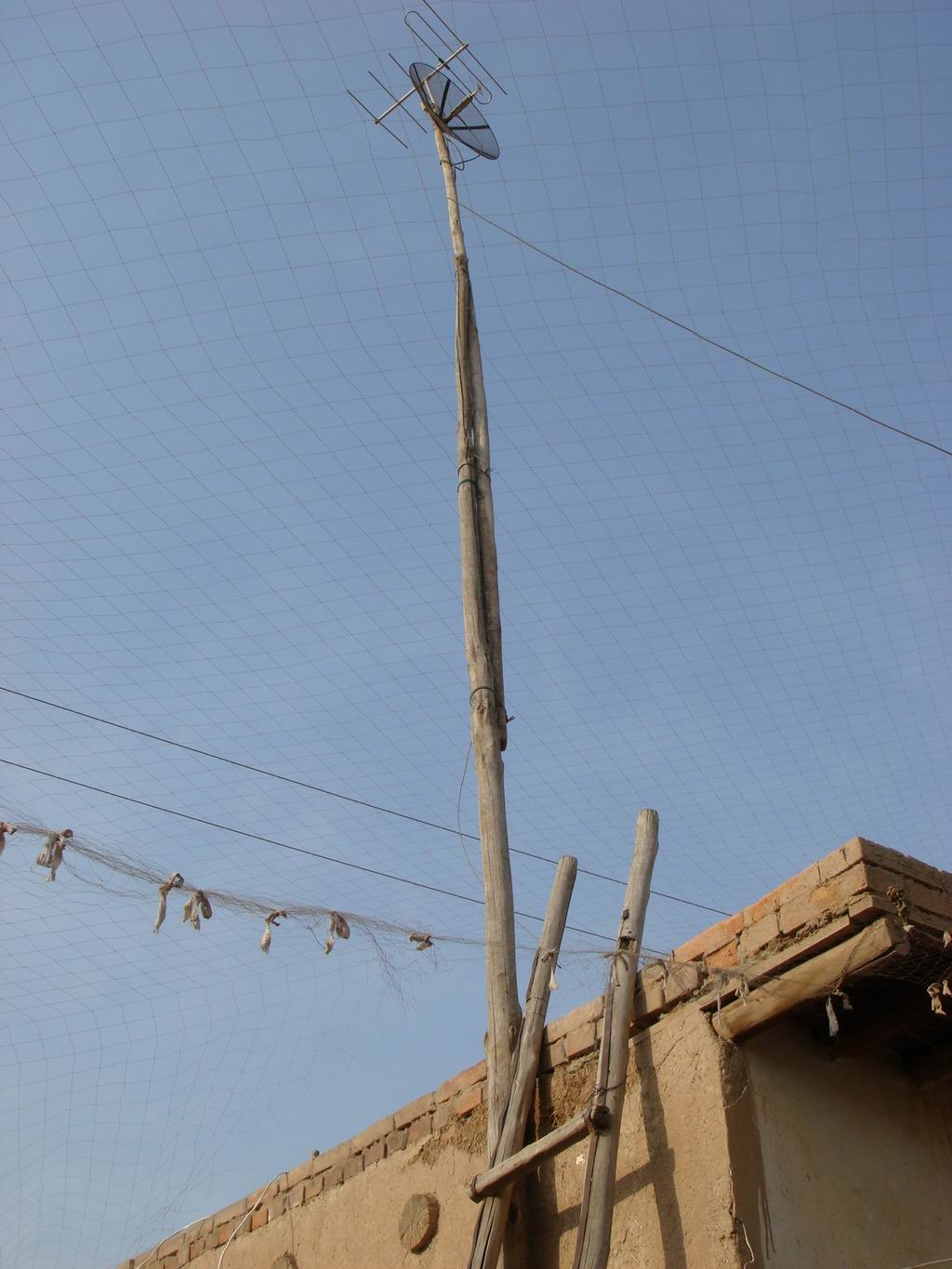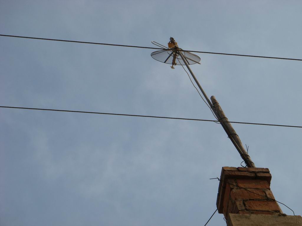 它看去只是有几根铁杆组装起来的铁架,其实,它可以接收到不同的几种电视节目.它是我家乡的最普遍的工具.