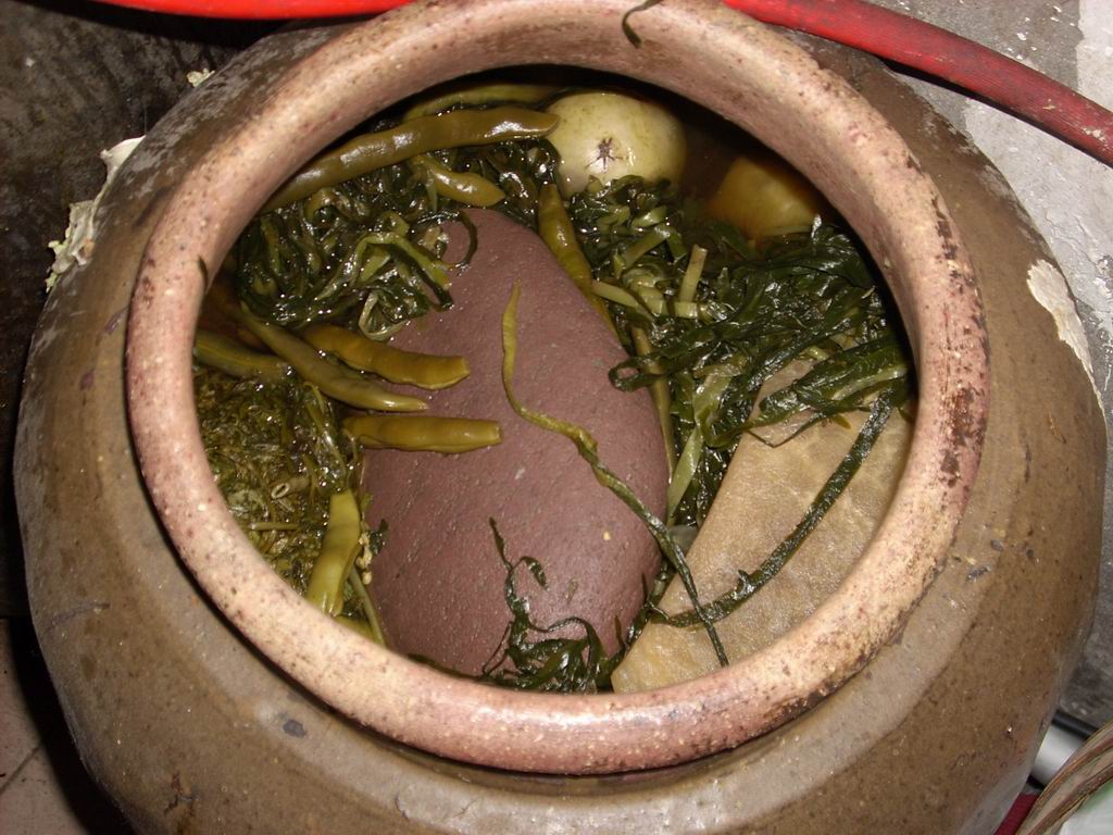 周末回到家,就看到弟弟正在帮妈妈拌咸菜,刚打开盖子,我们就可以看到里面腌制的咸菜,有青色的西红柿,豆角,韭菜和辣椒,在腌制时还要在上面放l两块干净的大石头来固定。