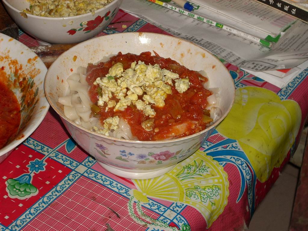爸爸把面捞好后,把炒好的西红柿酱和鸡蛋均匀的洒在上面,.