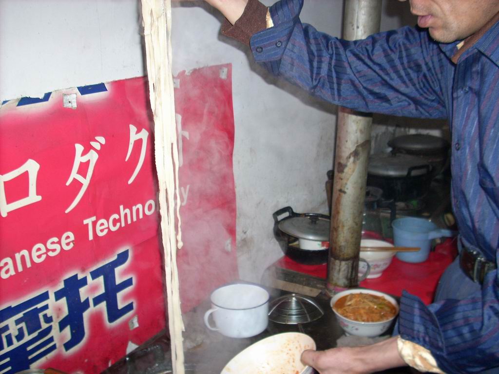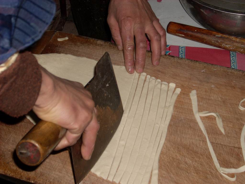 开始下面了。把切好的面轻轻的拉长,让它变的细长而薄,然后放到沸腾的水锅里,注意不要把面拉的太长,不然会被煮断,就不好吃了。