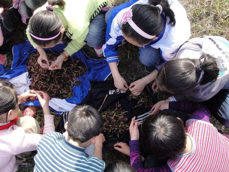 稍微休息了一下,有同学就提议采鱼腥草,于是大家一起奔向了草丛。你看大家采得多认真啊!我也不示弱极力寻找最多的鱼腥草,一会儿工夫我和大家就采了两大包鱼腥草。