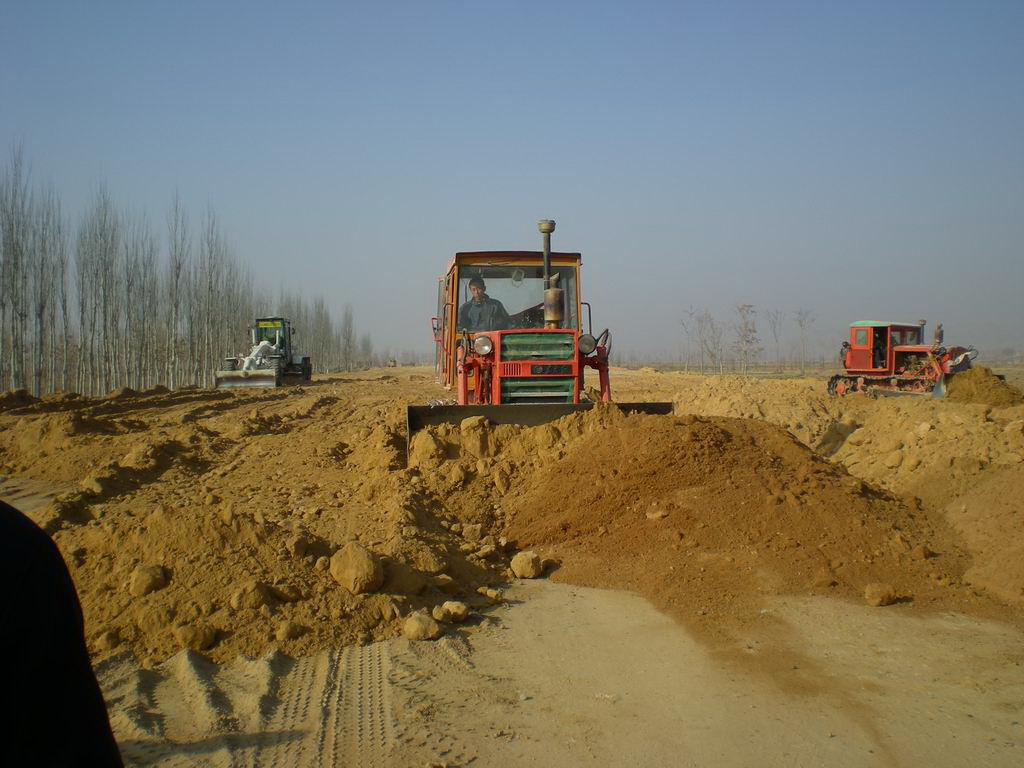 当一列列的车队把拉来的土倒在这的时候,推土机就开始了它一天的工作,你看,它正在用力把一堆堆的土推平。这黄土在阳光下也显得那么厚重。