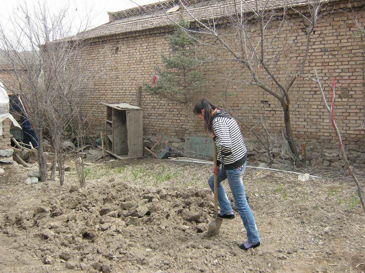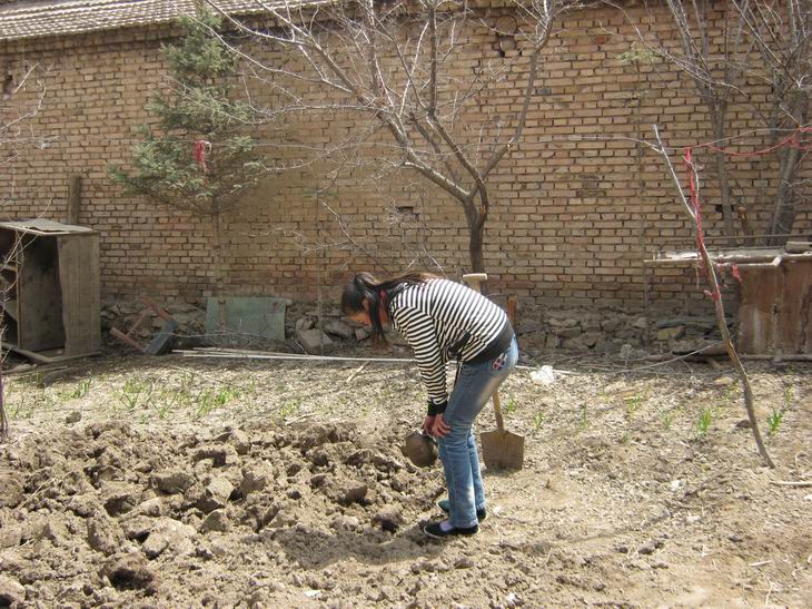 种花开始了,妈妈让我俩把捡来的马粪全部洒在花池里,然后说:"丽蓉,你去把地翻一下。"可我不知道怎么翻呀,妈妈就给我做了个示范,于是我上去右手抓住铁锹把的下面,左手抓住上面,再用右脚踩住铁锹,深深地把铁锹踩进地里,再使劲往上翘,把土翻起来,然后用铁锹把土拍平,就这样,我和妹妹一会就把地翻了一遍。