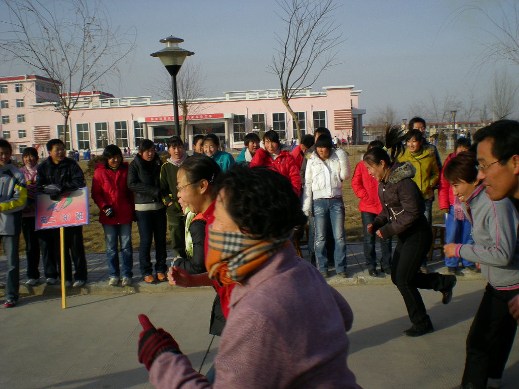 看,比赛开始了,老师们不论年龄,不论男女,一起向前冲去,旁边的同学了在大声的给老师们加油助威呢!