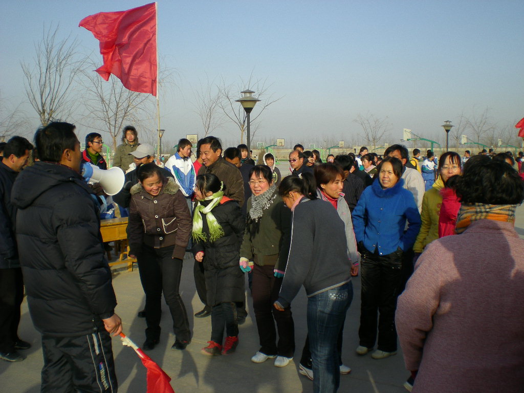 今天学校组织了一年一度的"迎春杯"越野赛,现在要举行的是教工比赛。看,老师都已准备好了,有的互相鼓励,有的在互相说笑以释放紧张的心情。别看他们平时在讲台上都很严肃,但是到了真正的运动场上却也向我们一样孩子气。