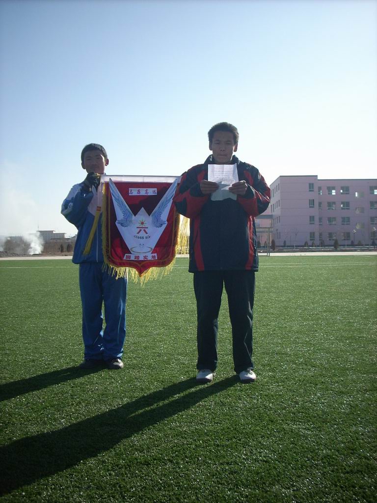 这是我们班主任站在班旗下的进行元旦祝词。他为了我们呕心沥血,付出了他最大的努力,我们尊重并爱戴他。现在他要求我们要发扬风格,赛出友谊,赛出水平,以饱满的热情和斗志迎接新年,迎接奥运!