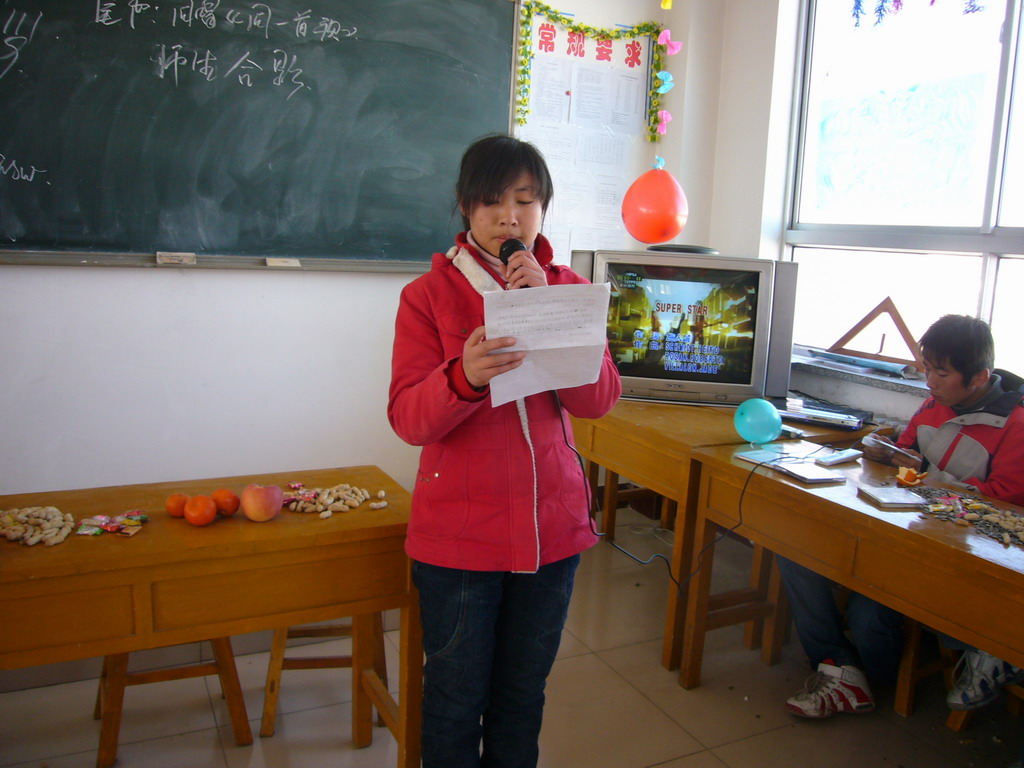 瞧!这位活泼可爱的女孩,她就是我们班的文艺委员——李茹,别看她个头不高,她可是多才多艺的小精灵啊!她的精彩致词,代表了我们每一个人的心声,我们将带着这份愿望,勇敢迎接2008年的每一个挑战。